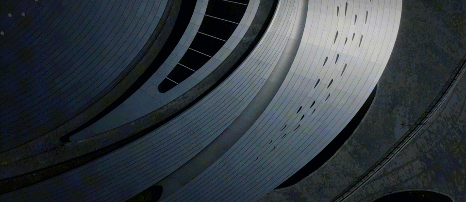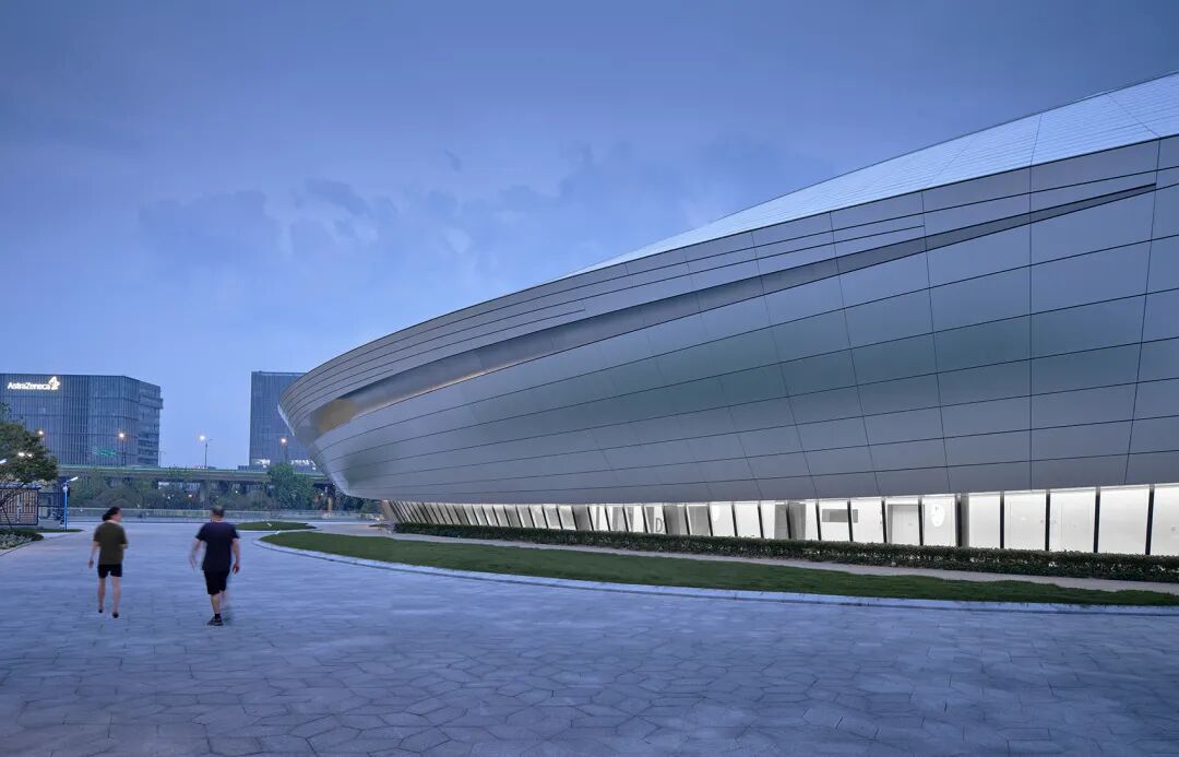 电竞中心建筑表皮被双曲面阳极氧化蜂窝铝板覆盖,在天空的映衬下,立面呈现出一种微微反射周边环境的效果。随着曲面的不同角度转换和人群视点的移动,逐渐削减了建筑的“重量”感。动感流畅的银色建筑犹如时空穿梭中的“星际战舰”,连接幻想与现实,融合建筑与环境。