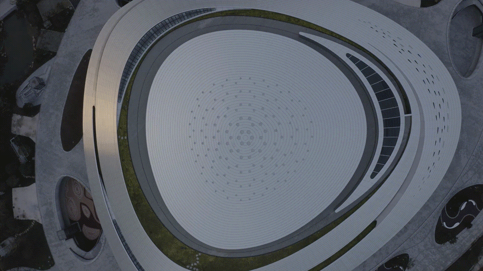 设计从电子竞技项目中“科幻、未来、动感”的第一印象出发,着眼于星系内天体之间由引力所产生的“星际旋涡”般的运动轨迹,并将这一理念在电竞中心外观和周边景观的设计上展现得淋漓尽致。建筑外围大量采用自由曲线设计,引入螺旋形绿化带,以象征天体运行的动态之美。