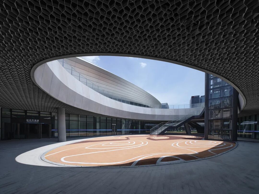 主场馆外观形态复杂,让人联想起外星来客,极致的技术美学似乎全然出乎人们的常规预想。但其内部结构以自然法则建构逻辑,以技术能力探究人类制造美的潜力,展现出技术理性所能呈现的逻辑之美,同时又仿佛超越了地心引力和结构法则的束缚。
