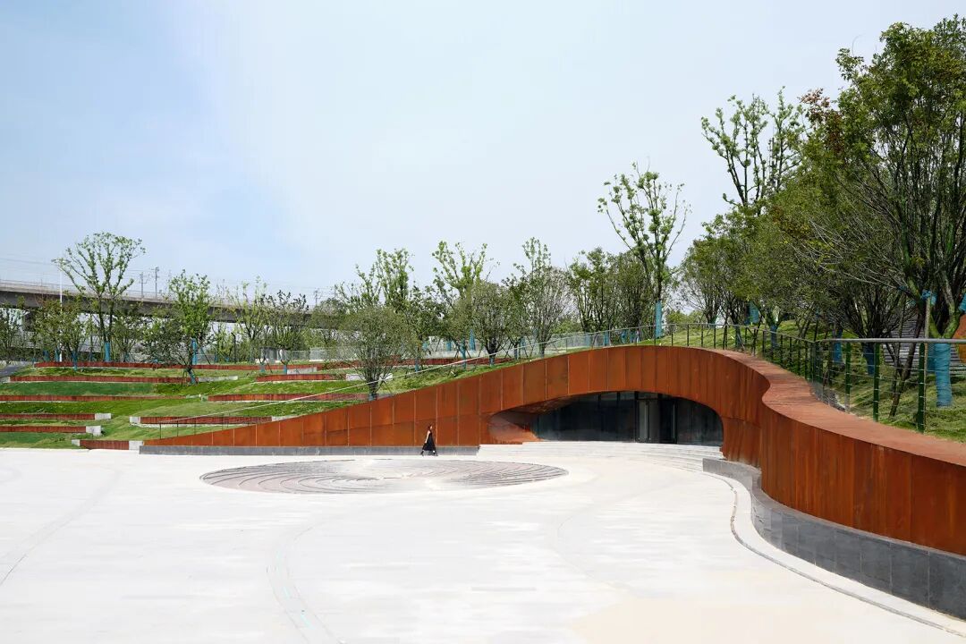 面对项目基地周边的环境,建筑师采用了一种面向公园和当地居民开放的姿态来设计电竞中心。这是一个复合体育场馆和生态公园功能的公共场所,建筑外围的下沉广场与庭院给地下空间带来阳光与空气,为场馆的户外展示和人们交流休憩提供怡人场所。
