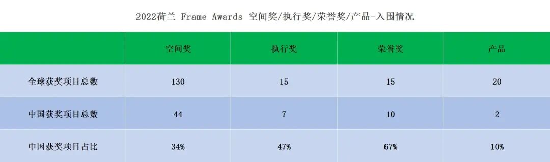 本期全球设计奖项研究所为大家整理了2022荷兰 Frame Awards在空间奖/执行奖/荣誉奖/产品的中国入围名单。据统计,本届共有180个项目/公司/业主入选,其中中国63个,占比35%。值得一提的是本届在空间奖-零售空间/年度单一品牌店、接待空间/年度娱乐场所、办公空间/年度共享办公空间、机构空间/年度医疗保健中心、住宅空间/年度厨房&年度卫生间、产品/年度照明产品&年度饰面产品8小类中无中国项目入围。