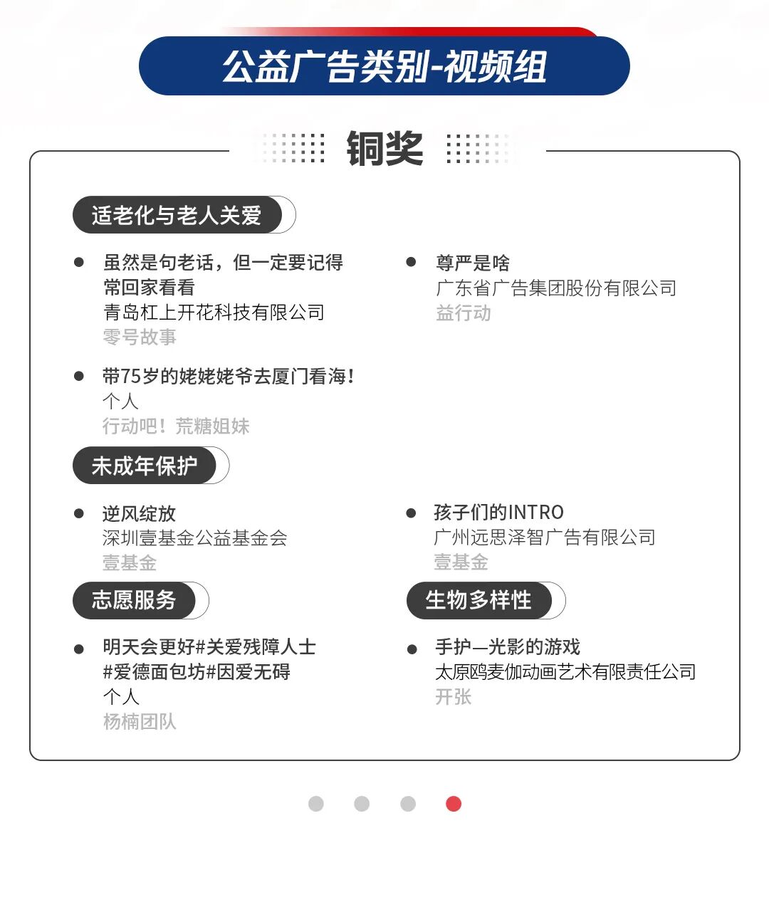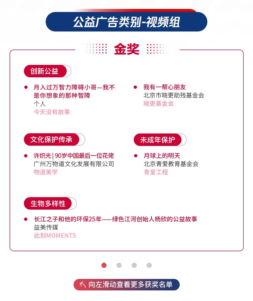 此次大赛征集了24000支视频作品,全网播放量达3.62亿。最终,视频组评选出5个金奖、5个银奖、12个铜奖,共计22个获奖作品,孵化出了如《我有一帮心朋友》《长江之子和他的环保25年——绿色江河创始人杨欣的公益故事》《月球上的明天》《罕见群演经纪公司》等优质作品,覆盖心智障碍群体就业、生态环境保护、未成年人保护、罕见病等公益议题。