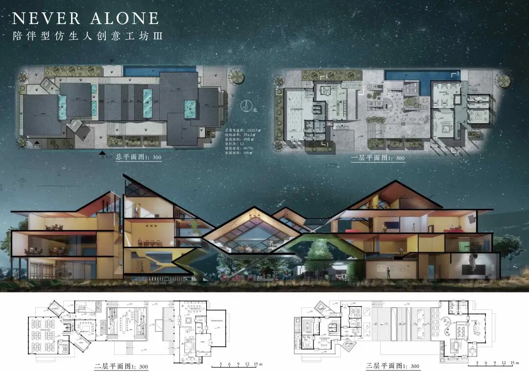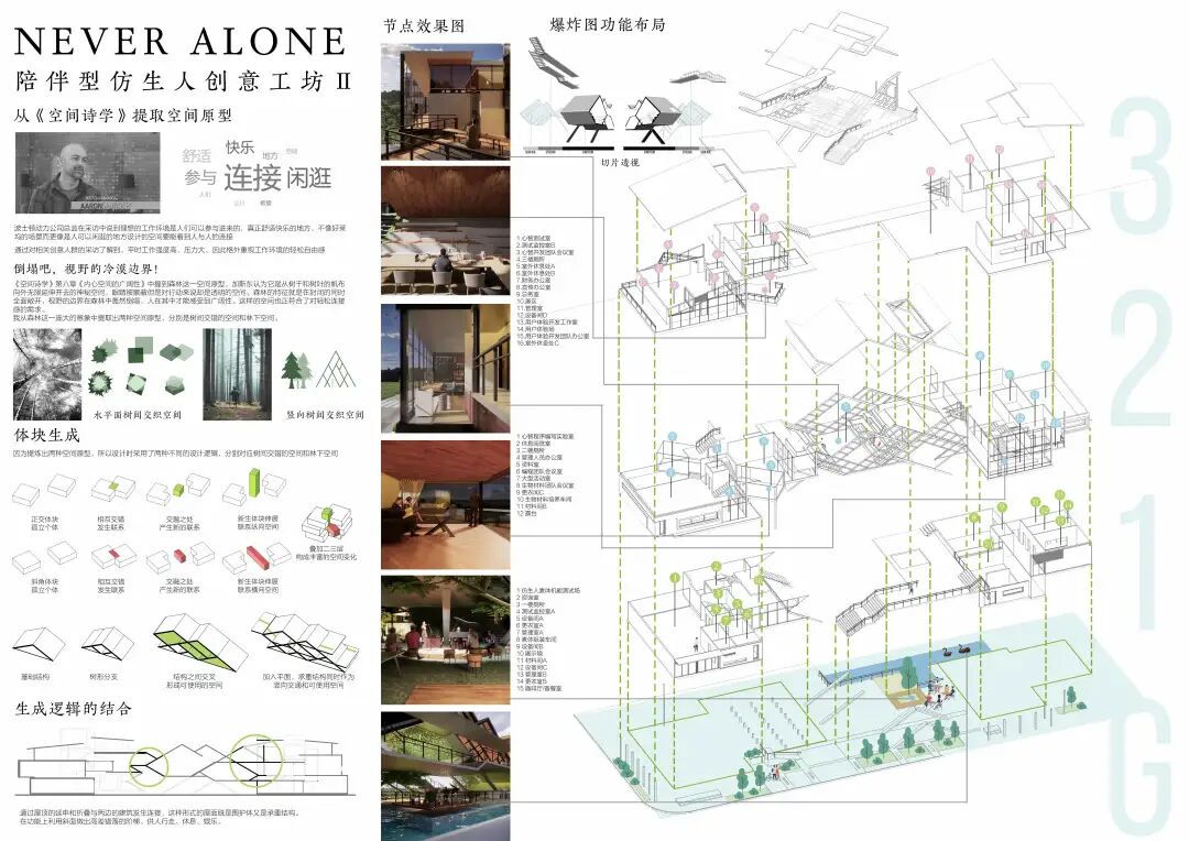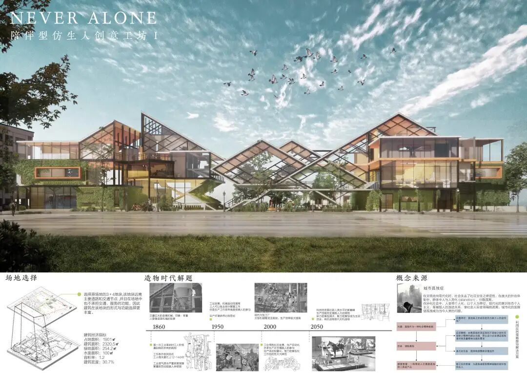 智造是新造物时代技术创新的趋势,此类创新产业带来的不同生产方式不仅对人们工作产生冲击,连带造成不同以往的精神世界及其社会关系需求。此设计选址大学城创意产业带,着重关照如何在日益数字化世界里打造一个喘息之地:“另类”工作空间,让创意人群在其中能找到精神放松和亲密温情关系。设计者希望人们在这乌托邦里,可以摒弃当下所谓“孤独地修行”式新教派“内卷”工作模式,能相互陪伴、精神互勉,迈向充满希望的新时代。设计方案视角开阔,涉猎从建筑学到心理学多个领域,空间形式逻辑清晰统一,设计概念精炼,方案表达细腻,层次丰富。方案体现设计者对社会现象和问题在空间层面上做出的积极因应和思考,极具启发性。