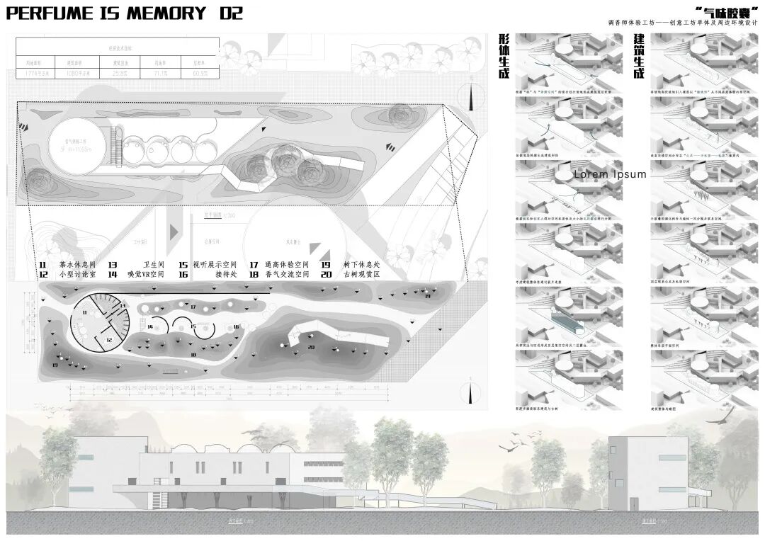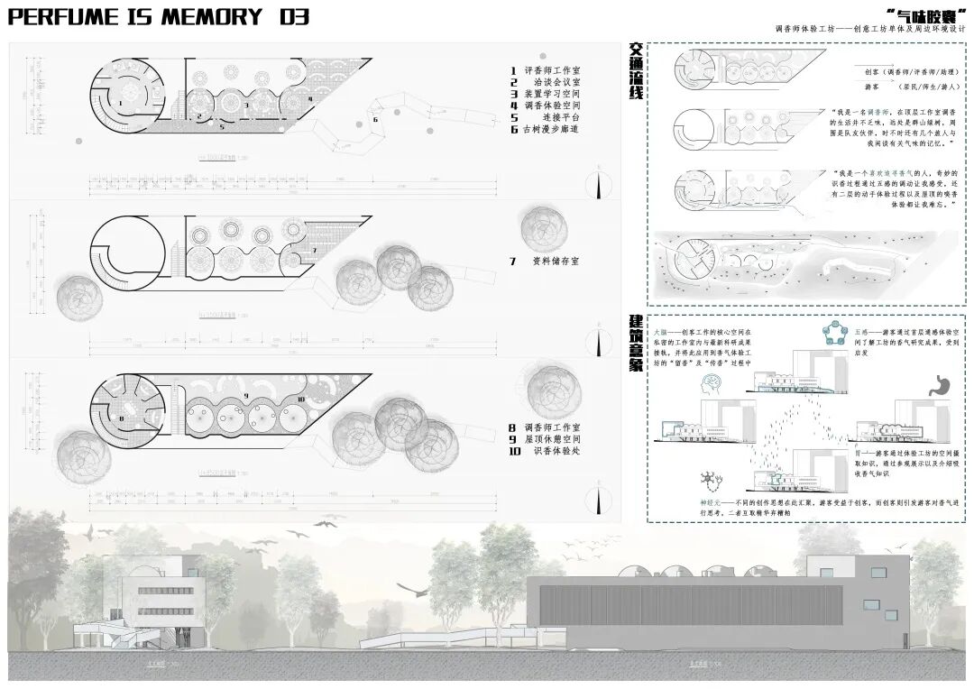 该方案以主观对气味的深刻记忆为出发点,认为调香师工作室应该提供研发、体验两种主要功能,并以简洁的几何形体为手段分别作出空间回应。以集中、紧凑的圆柱体作为研发空间的同时,该方案充分尊重、利用场地比较狭长,且在东部有数棵大树的特点,将体验的空间拉长、延展到整个场地和建筑的各个部分,形成了有节奏的、有机的空间序列。