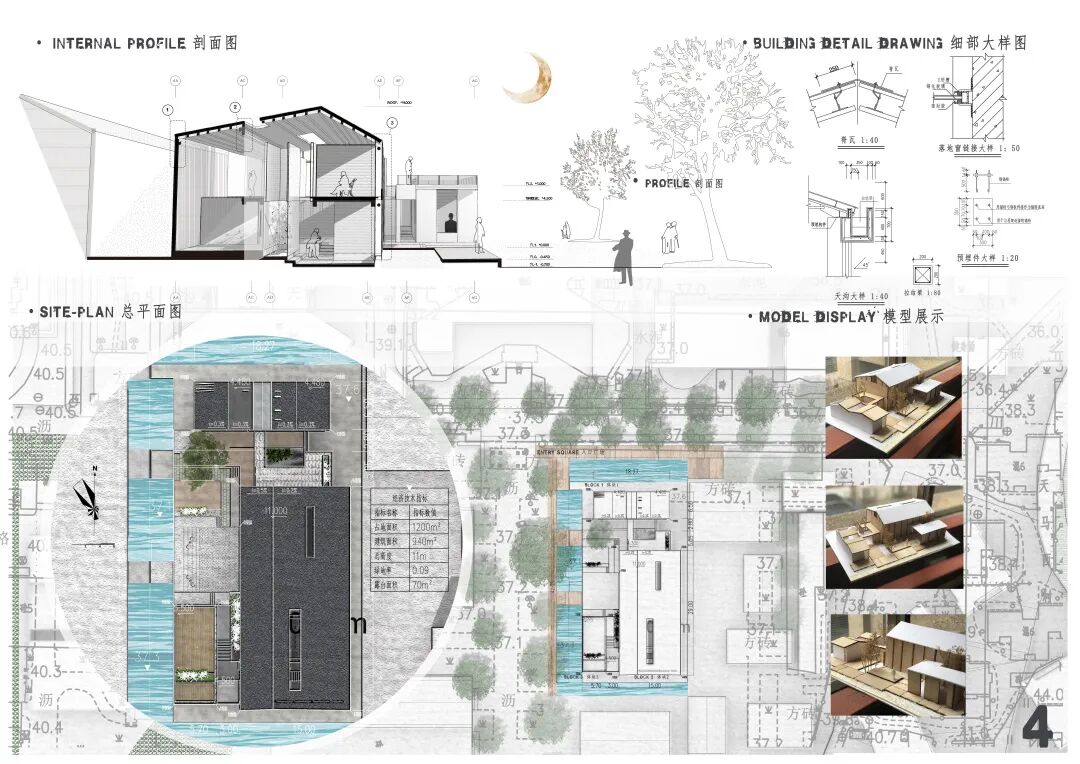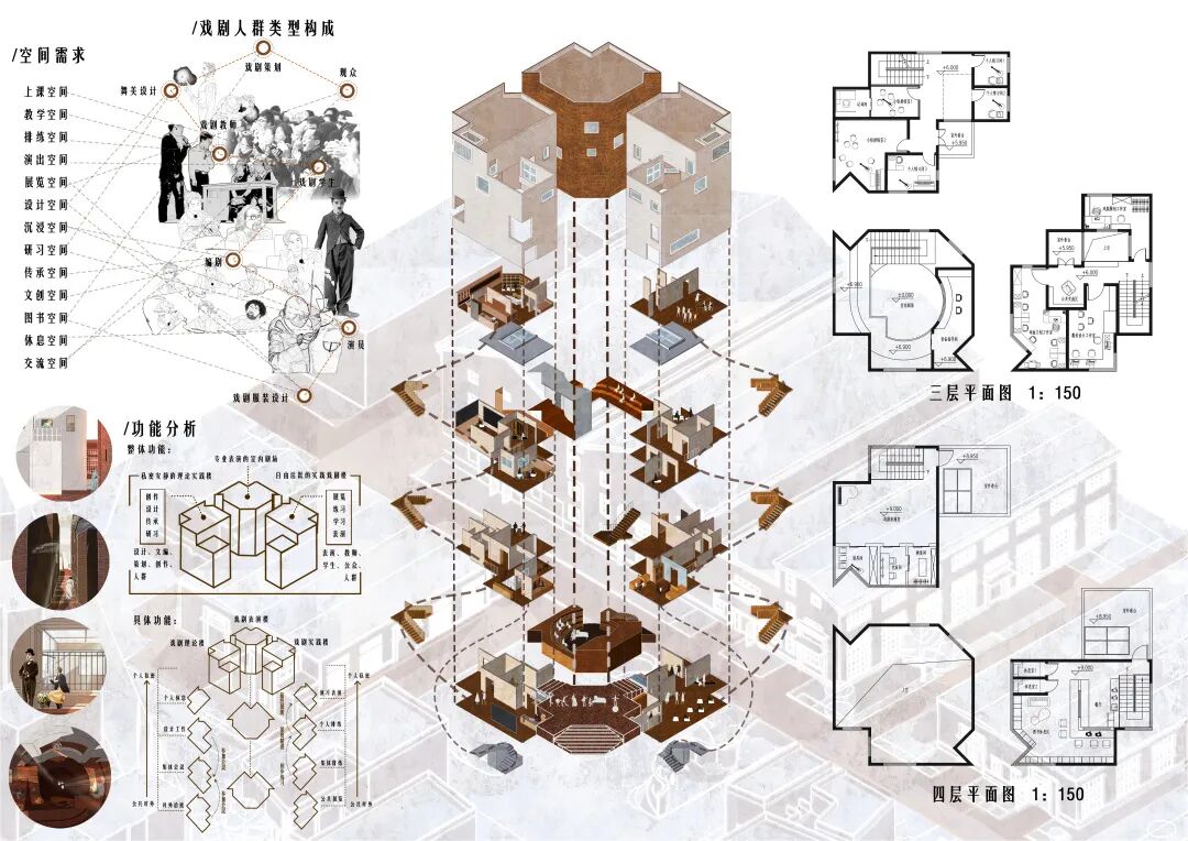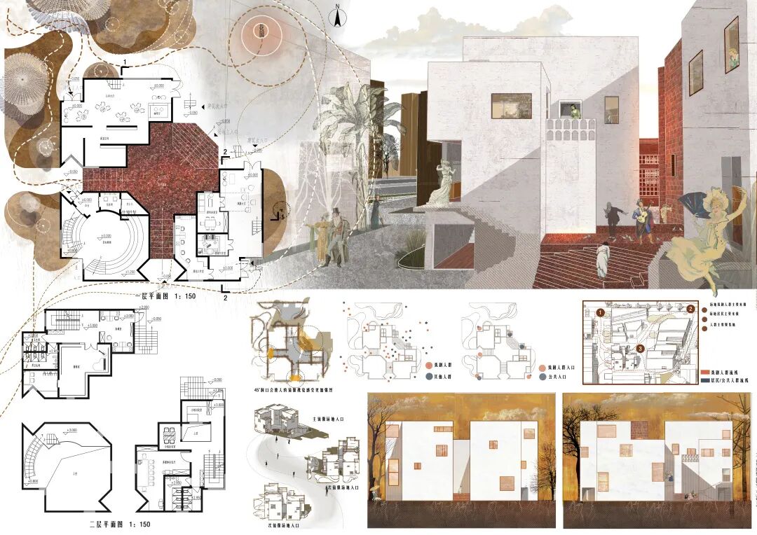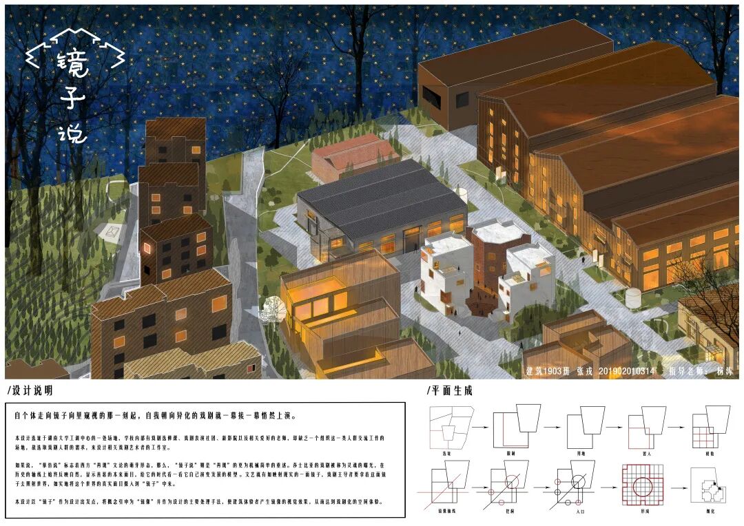 基于“戏剧艺术者工作室”的功能定位,提出以“镜像”作为设计概念与主要手法,将纯几何关系的生成过程在建筑上反映出来。在结合考虑周边场地条件的基础上,塑造了相对内向,但较符合特定功能空间特质的丰富的建筑场景,同时,尽力解决了异形平面所带来的使用上的问题。在表现上进行了有益的尝试,图纸氛围的营造契合了方案特点,是一份概念性较强、有一定实验性质的设计方案。