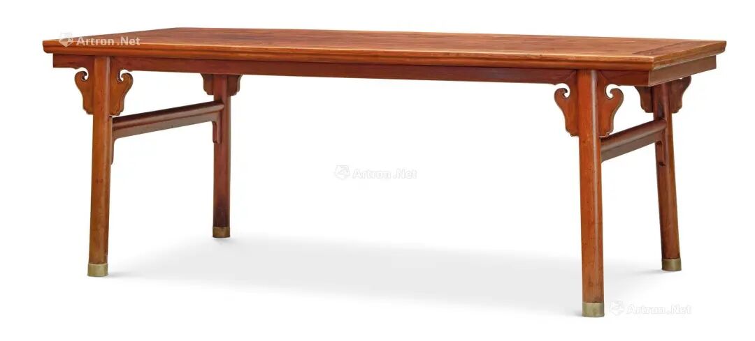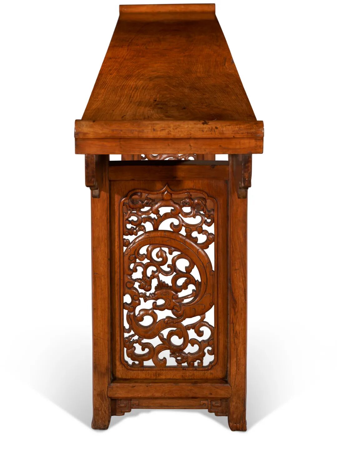 此案案面以巨型独板制成,面板厚度足有五公分厚,时年用料奢华考究可见一斑。此案有直牙条,牙头雕象纹,象鼻微卷,两象合视貌似卷云纹。牙头以夹头榫结构与案腿相连。侧腿间安透雕螭龙纹之绦环板。足下带托泥。北京故宫藏有两件以象纹装饰牙头之近似例,其一为制于明崇祯十三年(1640年)之铁梨木翘头案,其二则为一件明代黄花梨木雕双螭纹翘头案。此外,纽约大都会博物馆及明尼阿波利斯美术馆各藏一例与是次拍品相似的外翻足黄花梨大案,其尺寸为285.5及226.5公分长。
