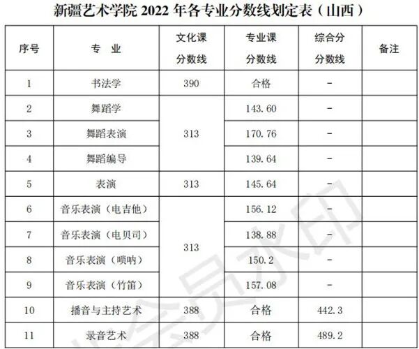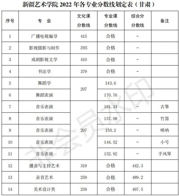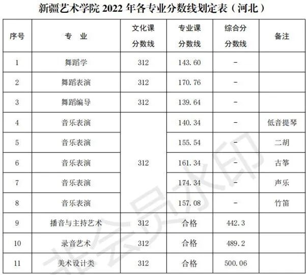 舞蹈学、舞蹈表演、舞蹈编导、音乐表演、音乐学(木卡姆与麦西来甫研究)、表演专业,在校考合格且高考文化课成绩达到我校相应专业录取最低控制分数线的前提下,按照志愿优先的原则,以专业成绩从高到低择优录取。