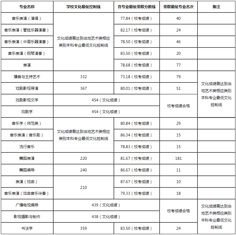 3.报考各专业的考生,须专业成绩合格(戏剧学、戏剧影视文学专业除外),文化成绩达到相应科类(文科、理科)录取最低控制分数线,按相应录取规则择优录取。