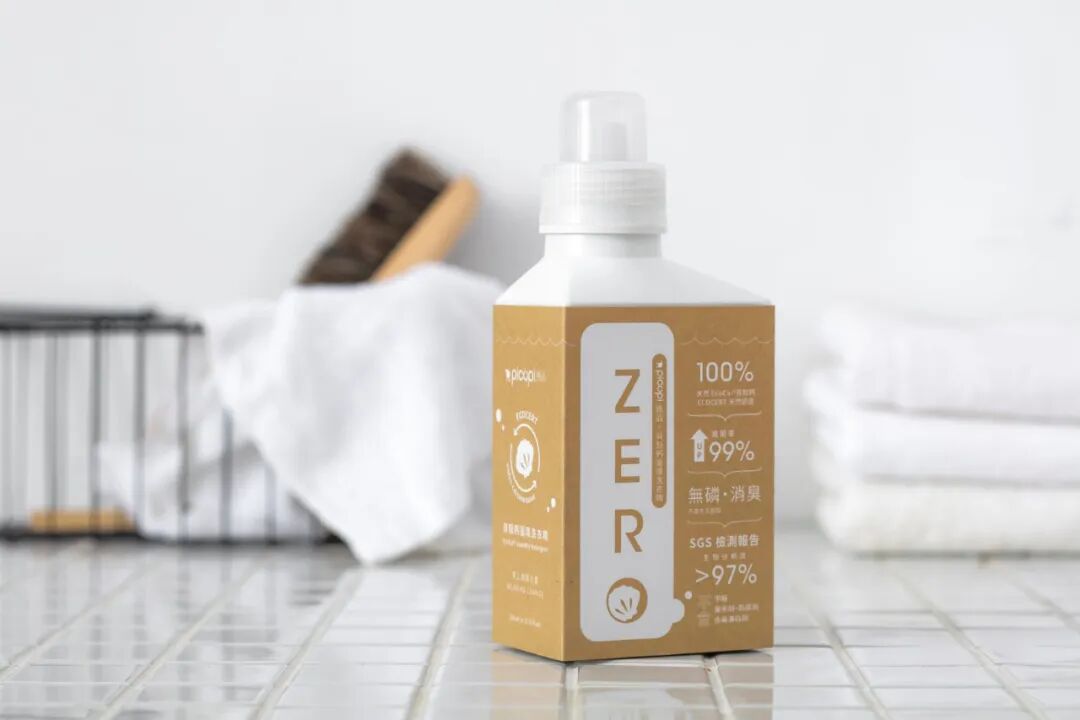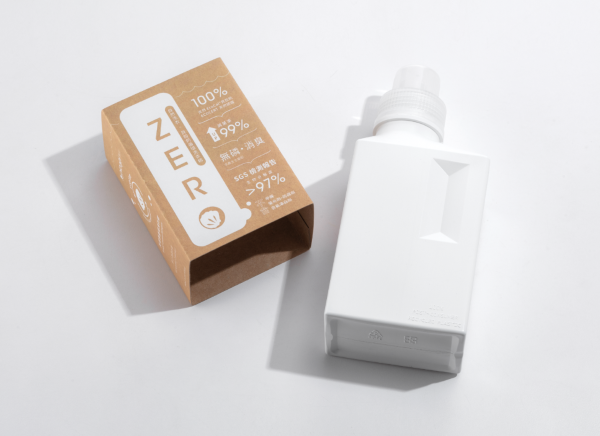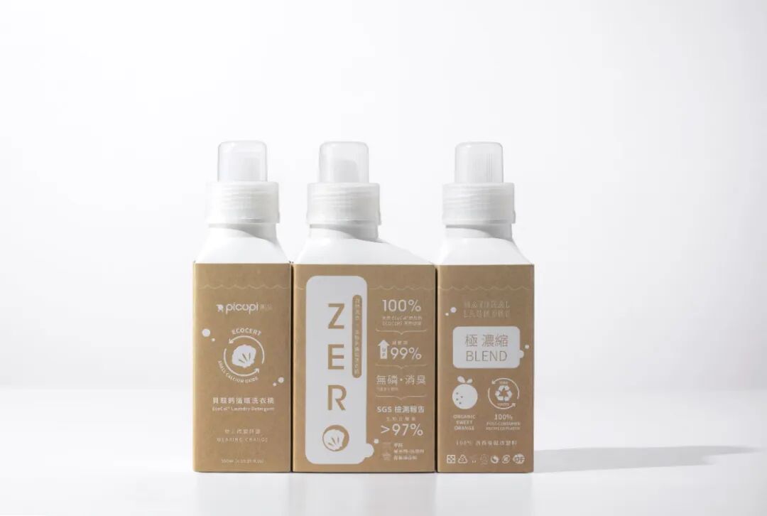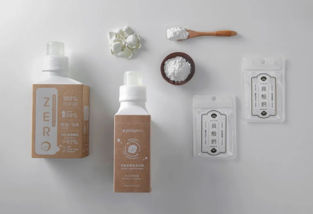 台湾第一瓶从内到外坚持零废弃的环保洗衣精。回收台湾花莲立川渔场黄金蚬壳高温锻烧出《EcoCal® 贝壳钙》粉,并以独家专利生产天然杀菌洗衣精。瓶器系回收100%消费后牛奶瓶,进行再生塑料造粒后吹塑成型而成。
