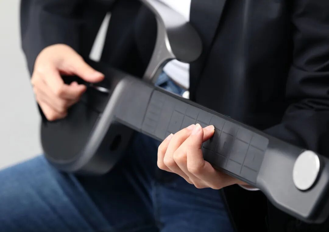 这是一款可折叠的智能吉他,仅有不到传统吉他五分之一的大小。采用全新的玩音乐理念“模块化演奏+颜色提示“,使用和弦进行模块化演奏,使用者只需要跟随产品的灯光提示弹奏,5分钟就能轻松完成伴奏弹唱。