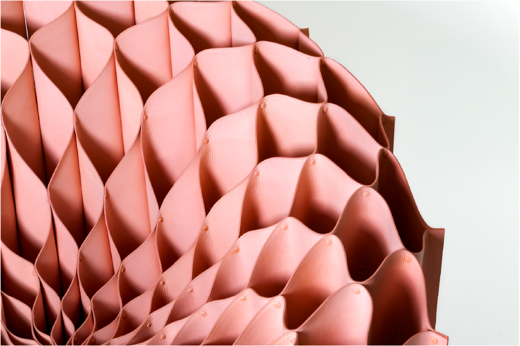 日本神户和牛世界闻名,但其牛皮薄且硬,难以使用,每年近有500头遭到废弃。我们历经2年的实验,运用建筑结构的思维,经过特殊的鞣制与缝合,重新设计去符合支撑人体重量的韧性与舒适,并设计BLOOM可开阖、折叠,因此省去了大型传统包装