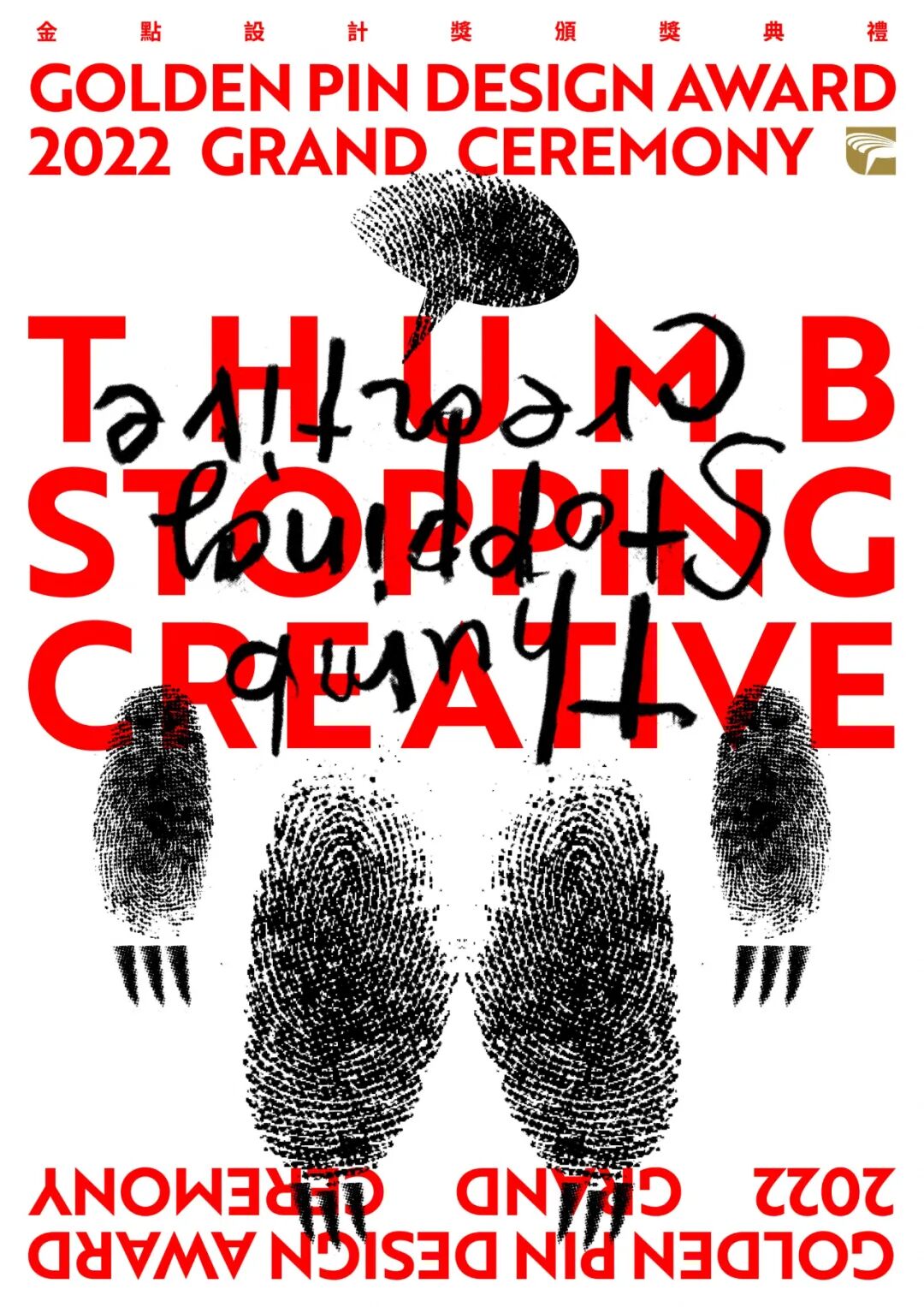 杨士庆从主题中的“手指”概念发想,以指尖触碰所留下的指纹展开创作,并大胆仅以几枚指纹构成主视觉,搭配金点奖“点针”的经典图像,创造出趣味角色,上下翻转后更有变成掌纹的巧思。