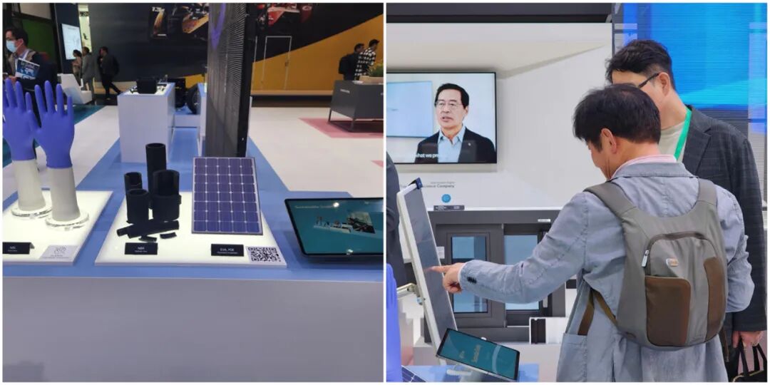 该展区展示了采用回收再利用材料制成的PCR产品、由100%生物原料制成的PLA、可实现生物降解的PBAT、用于延迟电池热失控的气凝胶等。