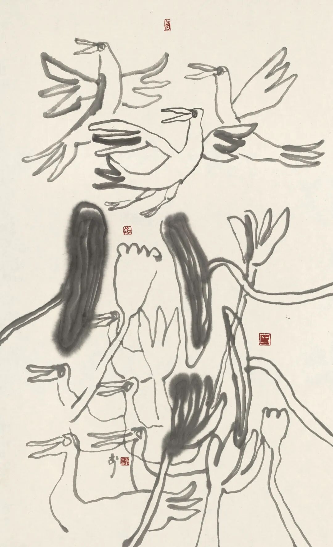 第二个特征是他将文学性、戏剧性和音乐性带入抽象艺术。在李磊那里,无论是绘画创作还是展览建构,都有自己的“意味”动机。对历史的叹喟、对生命的体验、对时间与生命的追问等这些重大命题都成为他表现的出发点和艺术过程中的动力,这类文学性、戏剧性乃至音乐性因素的介入和运用,使他的每次展览都有一个新的主题,他在展览中的每部分作品就如主题的展开部、转换部、延伸部。本次展览的题目“谁持彩练当空”,就带有历史的追寻和文学的抒情意味,这也是李磊的艺术诗性的集中体现。