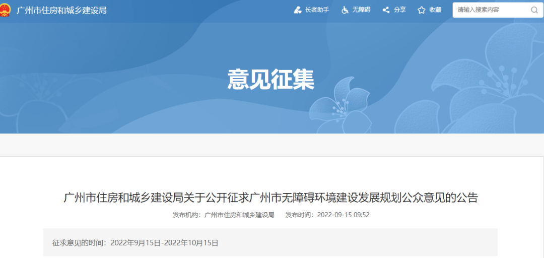 2022年9月15日,广州市住房和城乡建设局发布关于公开征求广州市无障碍环境建设发展规划公众意见的公告。