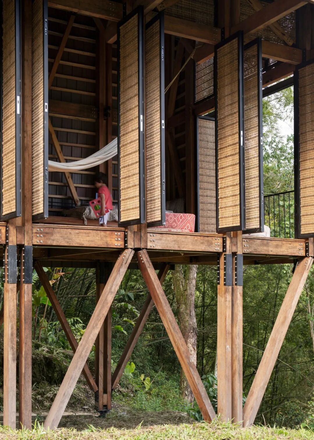 由建筑师 Santiago Pradilla 与建筑集体 Zuloark 共同设计的哥伦比亚木结构房屋,由编织木屏风的立面过滤光线和空气,作为更具可持续性的当地建筑形式的原型。