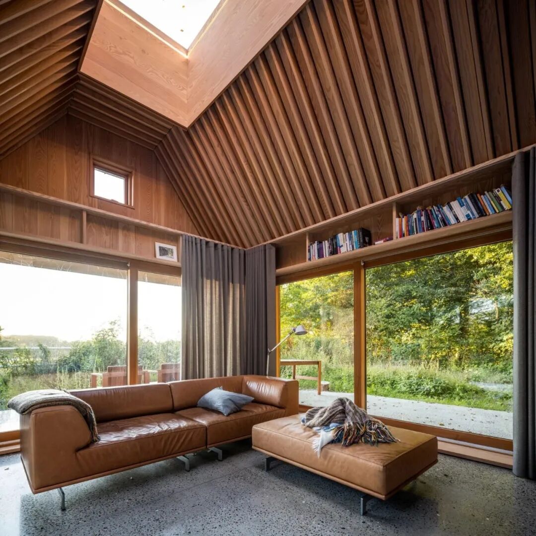 每一个都使用相同的预制元素,这些元素组合在一起形成宽敞的内部空间,其特点是高高的天花板向下弯曲与墙壁相接。这个特殊的 Indigo 小屋的大小为客户提供了充足的空间,可容纳宽敞的开放式起居区和后方的两层卧室。