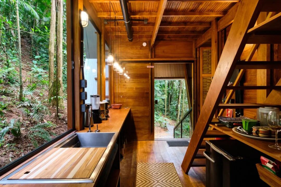 名为 Tini 的小屋是提前预制组装完成以后放在准备好的地块中的。小屋室内的设施齐全可以满足度假的一切需要。