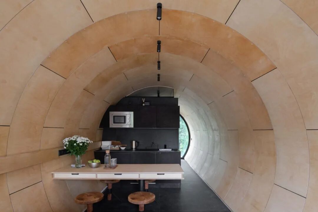 这座度假屋是为一年一度的 Archstoyanie 节而设计的,该节被称为俄罗斯的“火人节”,活动结束后这个管状小屋将留在原地,为户外艺术画廊的游客提供住宿,该画廊位于卡卢加市附近的自然保护区。