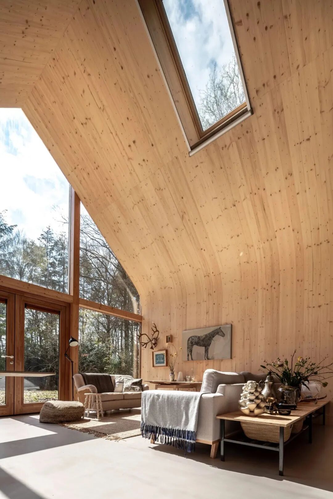 阿姆斯特丹工作室 Woonpioniers 在荷兰的一片林间空地上隐藏了一个带有大窗户和高大弯曲内饰的预制木屋。用预制的层压木材创造了这个小屋,整个结构的碳足迹设计得尽可能小。