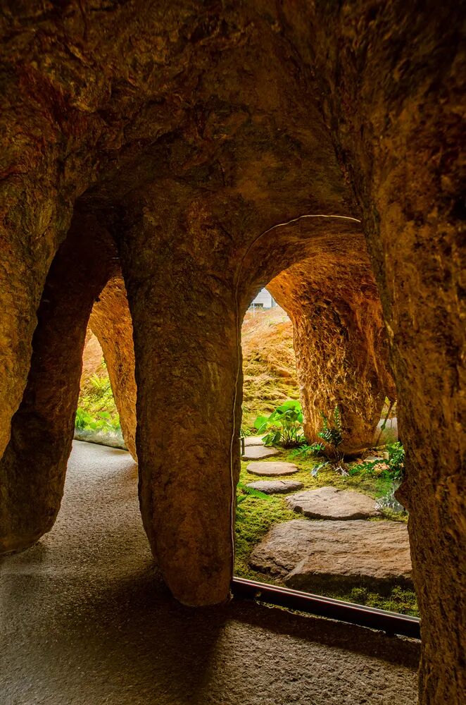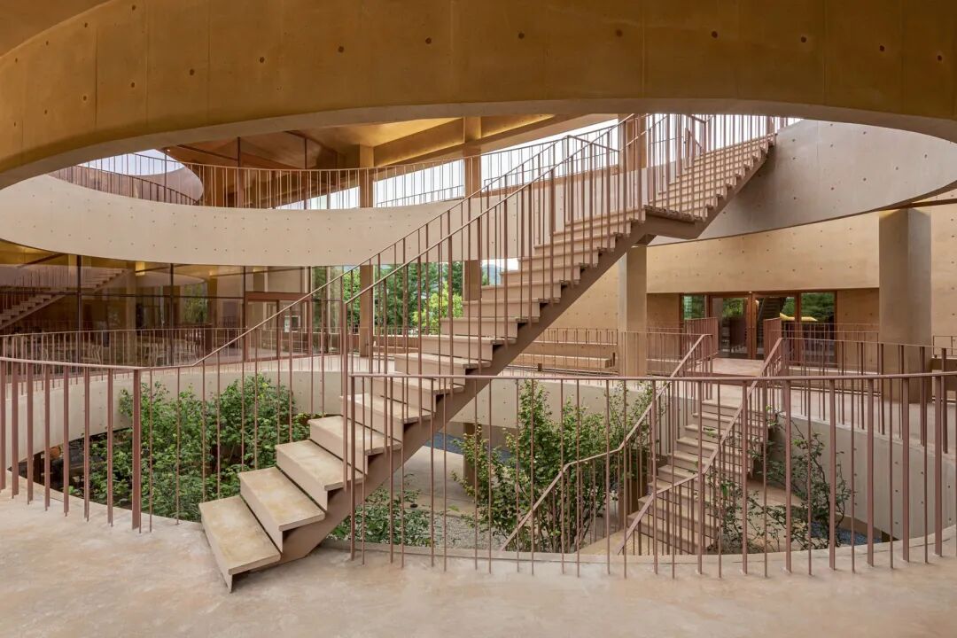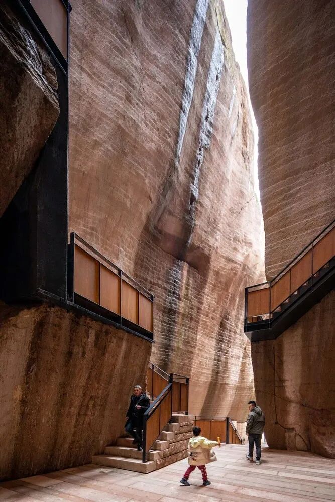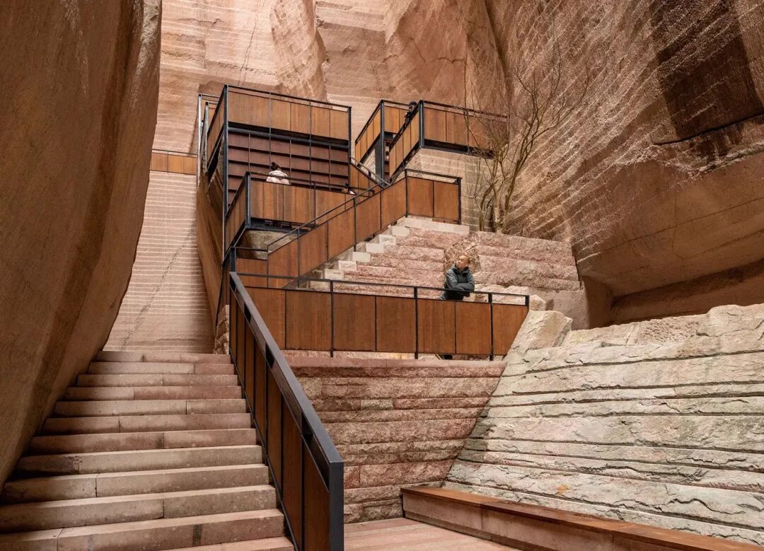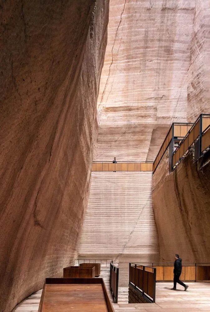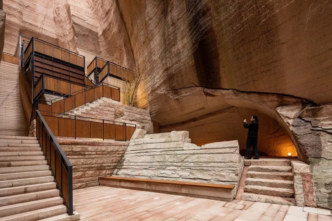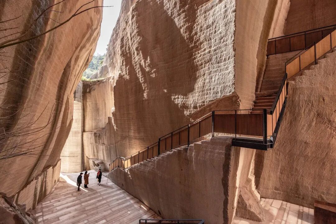 石宕内部的不同平台被利用,成为阅读、学习的场所。这个空间向山谷中延伸约 50 米,净高度接近 40 米。这个洞穴形态也是从上部往下方手工开采的结果。室内的横向石阶超过 5 层,高达 12 米,需要一定努力才能攀登。这些平台通过楼梯到达,设置有书架和学习的地方,访客可以沉浸在石刻和书法的世界里。
