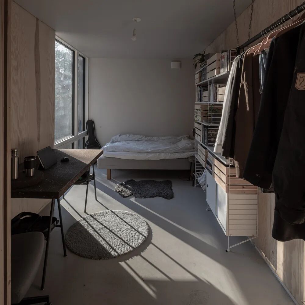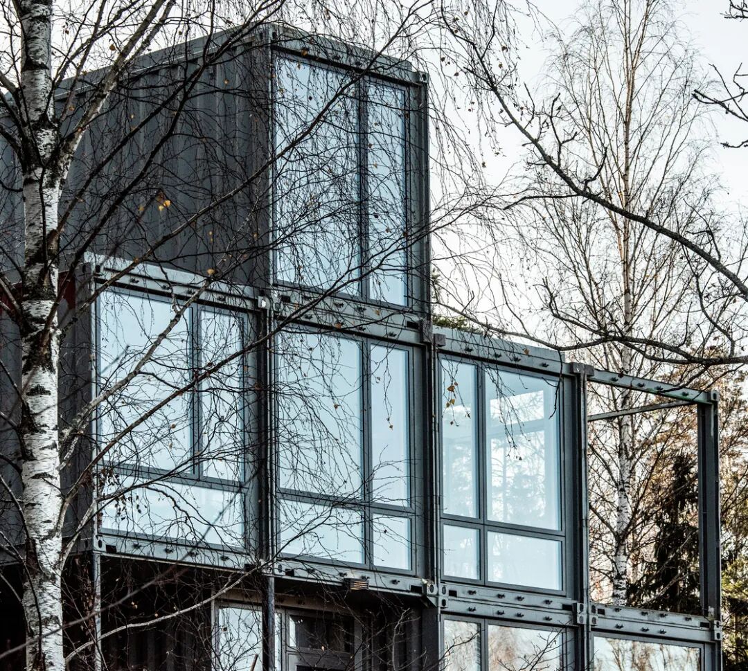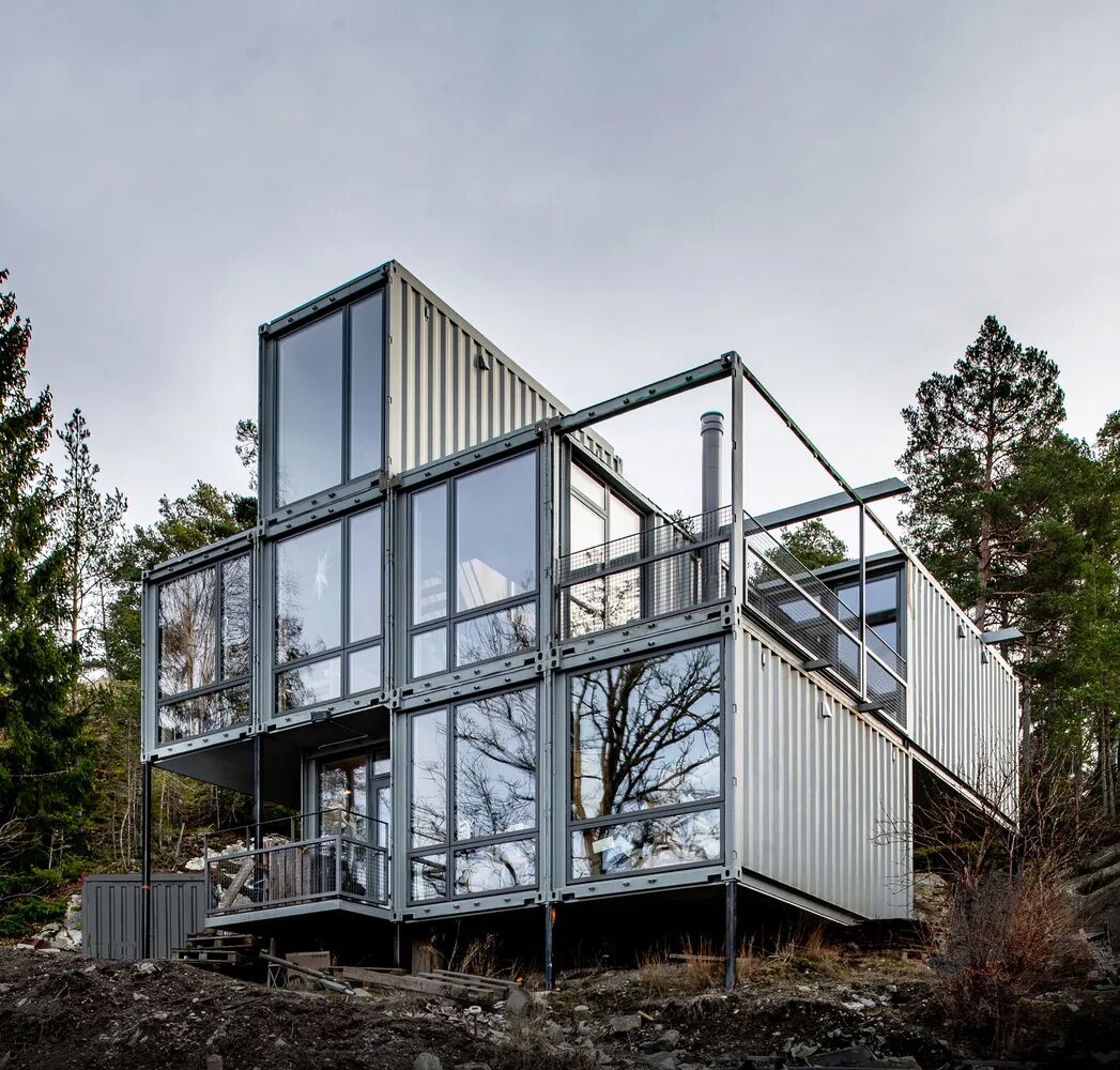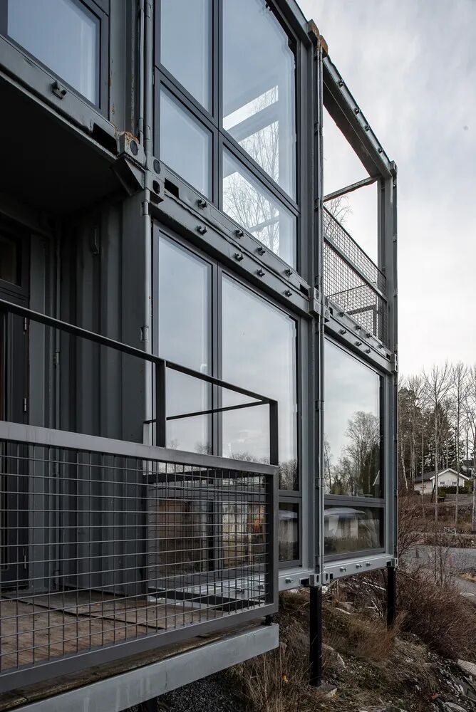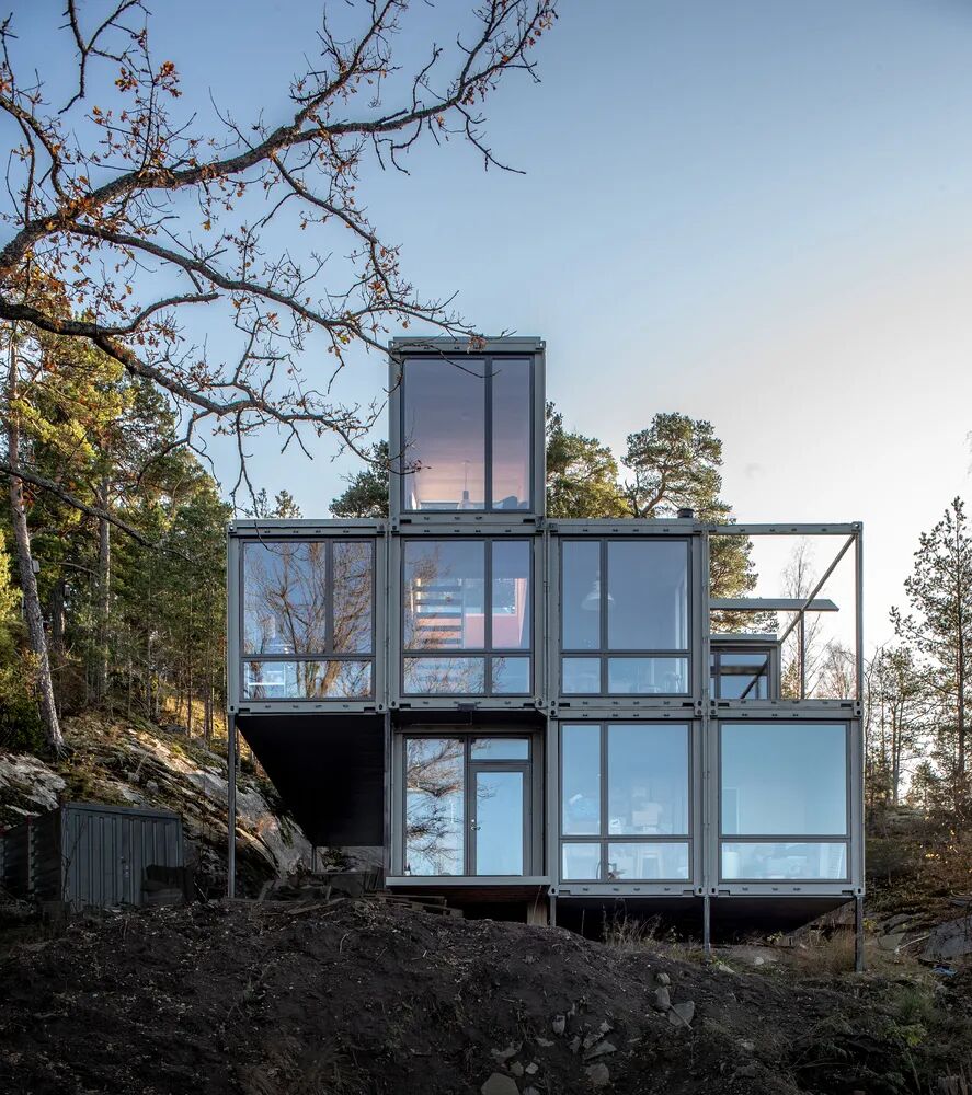这个家庭住宅是由8个6米(20英尺)宽和12米(40英尺)长的再利用航运集装箱组装成的。房子建在斯德哥尔摩郊外一个湖边的陡峭地段。该地块禁止爆破,也没有空间铺设石板,只有一个陡峭的峡谷,大量的雨水流向湖边。