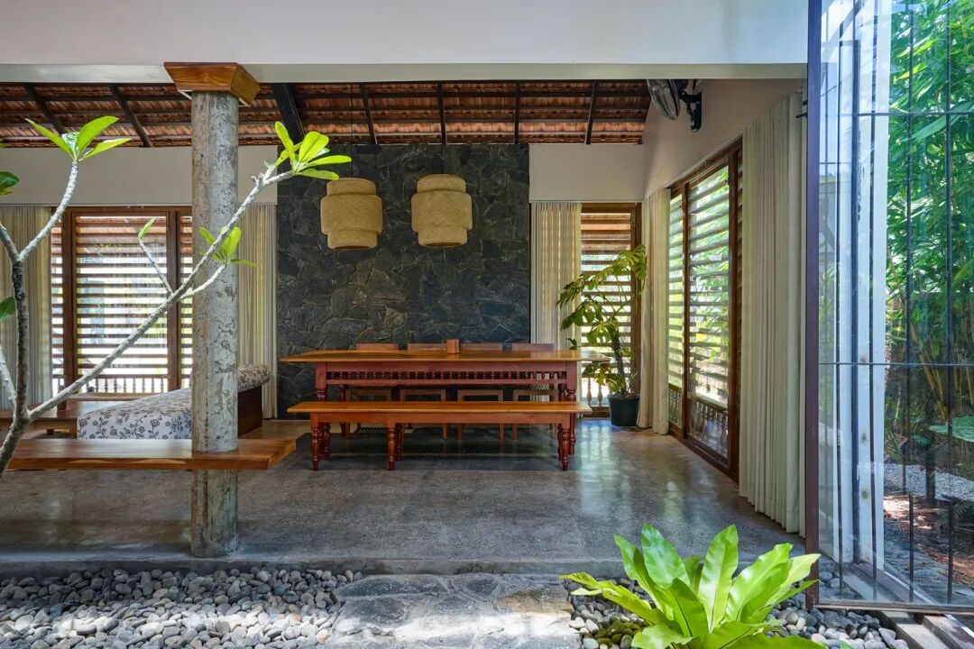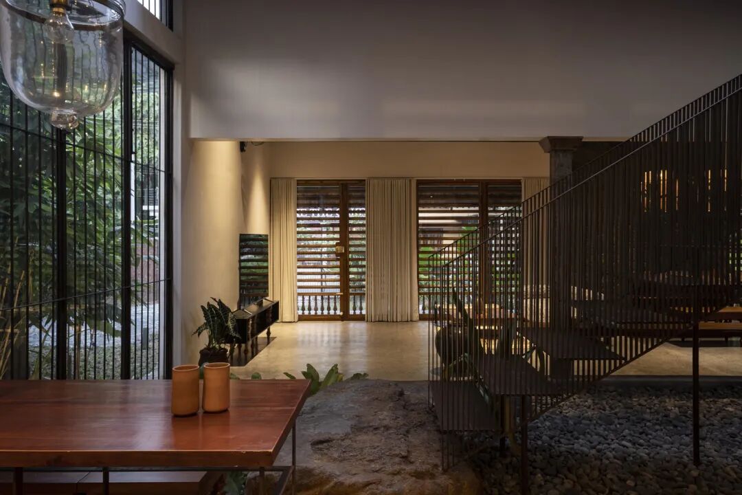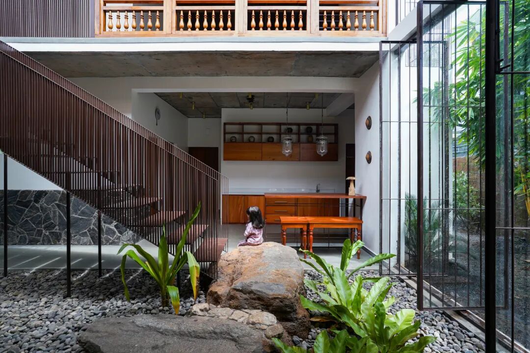 在庭院周围一边是客厅和餐厅,另一边是卧室和厨房。巨大的天然巨石被放置在庭院里,上面有浮动楼梯,周围都是绿色植物,这个庭院成为了房屋的焦点空间。