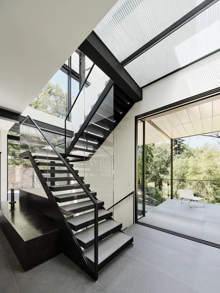 项目旨在加强结构与附近水体和岩壁的关系。新结构系统并没有下压阻断溪流,而是锚定在山丘侧面的基岩上,从而将房屋完全悬挂于水面上。通过开放场地边界、使用透明材料、落地窗、透明地板和诸如悬浮楼梯的室外开放空间,使得从房子的前面后面都可以享受到自然水景。