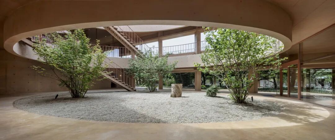 外墙提供了巨大的遮蔽空间,倾斜的屋顶给建筑带来了长条形的公共空间,内部空间由中央的庭院一分为二,提供适当的交叉通风和自然采光。