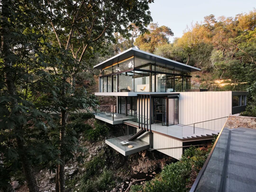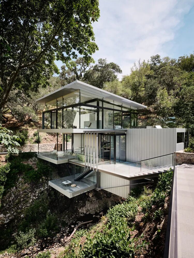 此改造项目横跨一条小溪,悬挂在加州的两座美丽山丘之间,在后院处还拥有一个瀑布。设计团队的目标是将这个结构重新联系于环境之中,同时也为业主最优化利用这个特殊的场地。