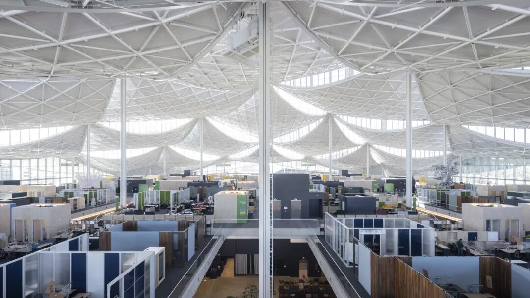 谷歌湾景园区的地理位置临近 NASA 埃姆斯研究中心(Ames Research Center),其场地面积约 169968 平方米。虽然园区由三栋单体建筑构成,但是每栋建筑上都覆有轻质雨棚架构,由此园区有着连贯、统一的整体形象。