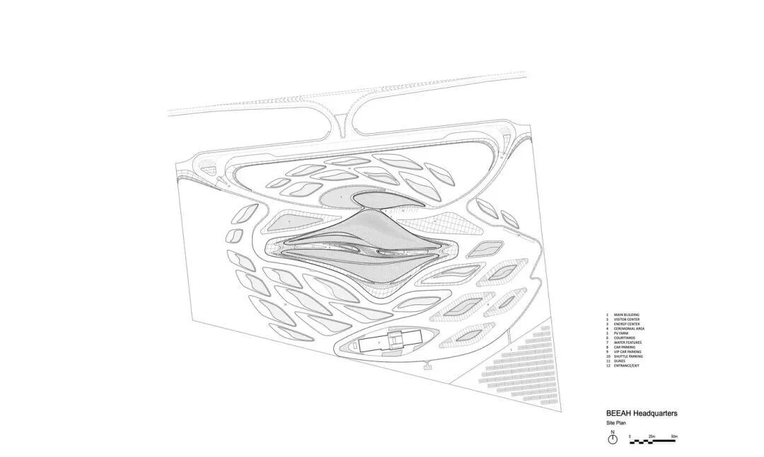 BEEAH 总部就好像一系列相互连接的“沙丘”,以其朝向及形态呼应着环境,并意在优化当地的气候条件。建筑镶嵌于沙迦 Al Sajaa 沙漠之中,并与周围的景观相呼应。它就好像一块原石在大漠中的盛行风中被塑造为相交错的内凹沙丘之谷和外凸沙丘之脊一般,逐渐在沙漠之中崭露真正的形态。