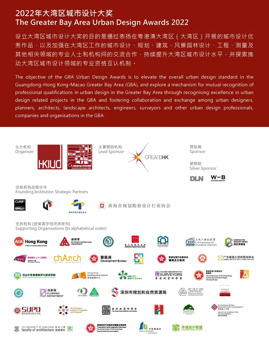 2020年首届大湾区城市设计大奖取得巨大成功,2022年香港城市设计学会再次获得香港特别行政区政府「创意香港」的赞助,再度举办大湾区城市设计大奖。本次大奖同时获得大湾区城市设计师联盟另外四家创始机构战略支持,他们是CURB建筑与城市规划中心–澳门、广州市城市规划协会、深圳市城市规划学会及珠海市规划勘察设计行业协会。