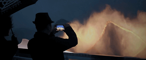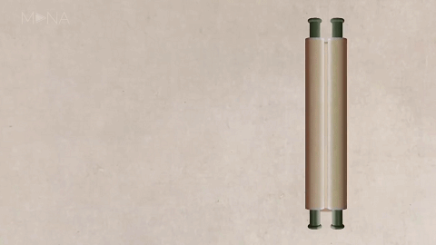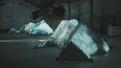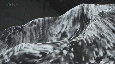 本次作品查阅参考了中国古代龙山文化、博山文化多种资料,并以此为影像的思想与内容。投影的基底形象则取《千里江山图》的青绿之意与我们的黄河装置相交融。作品影像交代的具体内容为:黄河之水天上来,奔流不止,一泻千里。黄沙随河水流淌堆积,形成上游清澈而下游混浊的自然特点,河水与附近土壤中的营养物质孕育了无数生物,形成一派欣欣向荣生生不息之象,而东方人类也在此处开始了属于他们的旅程。惊雷始,万物生。人类用自己的方式记录了千年历史,创造黑陶、拓片、文字等文化产物。“逝者如斯夫,不舍昼夜。”历经千百年,我们的祖先用双手打造无数现代化都城,而黄河会见证,这份刻在血脉里的勤劳将绵延不绝,流淌出更加生动进步,让人期待的未来。
