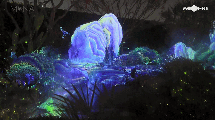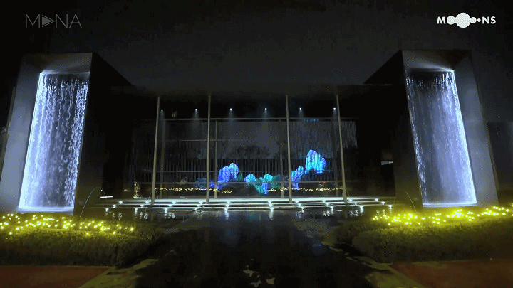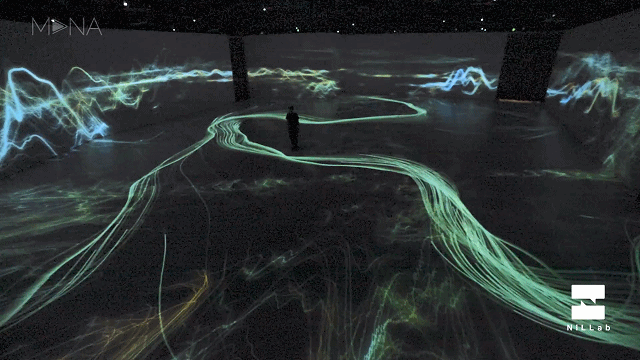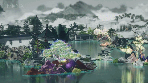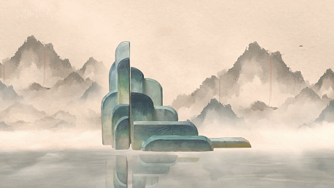 画面从平面到立体逐渐过渡,也从历史的长河中不断向前推进。千里江山的画面逐渐粒子化,为中华文明简史的展览叙事拉开序幕。从解读原画层层叠加的繁复绘制过程,到营造游于画中世界的沉浸体验,再及抽象演绎其青绿颜料的色彩分子与光影奥秘。随着影像循序渐进的变化,形成了对《千里江山图》从宏观到微观,从游览到沉浸的多维度视角演绎,以此开启对东方传统文化“智”与“美”的诗意表达。