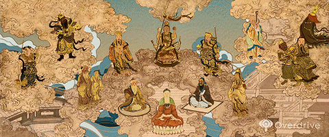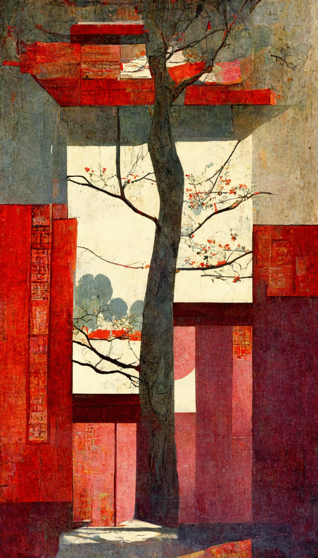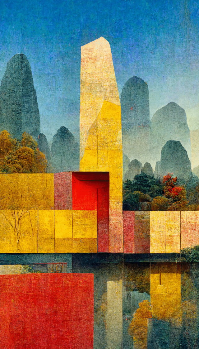 中国的绘画艺术从中国抽象写意到写实具象的发展路径与西方正好相反。中国人讲究的意境与想象空间和西方人讲究的具象逻辑思维,在某一个时空相互融合碰撞。西方抽象艺术的诞生其实在某种程度上具备了东方审美的哲学,人们不再以直观的画面叙事逻辑来评价作品,更加注重画面之外的情感表达。即白居易的“花非花雾非雾”和中国禅宗提出的三重参禅境界——“见山是山,见水是水;见山不是山,见水不是水;见山还是山,见水还是水的审美哲学。” 所以这组作品就是尝试用东方的元素如佛像、亭台楼阁等与西方的抽象色彩重组再构建。