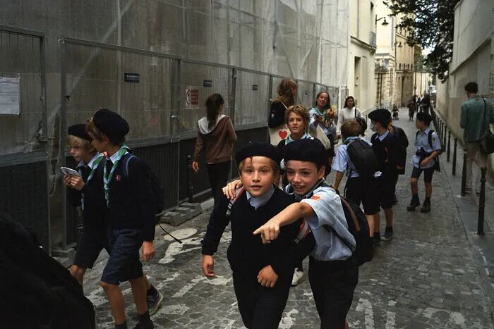 “当我在巴黎走来走去时,我听到远处传来一些孩子在说笑。我看到那是一群童子军,我知道那里有一个有趣的镜头。所以,我把自己放在马路中间,让他们面对我。突然,一个孩子拉着他朋友的肩膀喊道:“看那边!” 当他举起手臂指着我身后的某个东西时,我迅速拍了下来。”