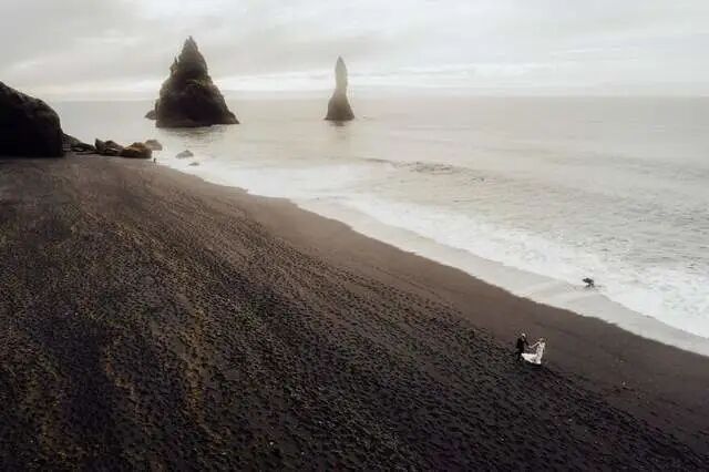 这张照片是在火与冰的土地上拍摄的:冰岛。蔚为壮观的黑色沙滩和依稀可见的礁石后面散步的恋人,使画面亲密、浪漫、雄伟。