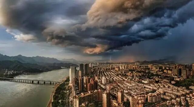 画面中,来自东南方的乌云与西北方向的夕阳形成了鲜明的对比。场面非常激烈。无人机刚落地,就下起了倾盆大雨。