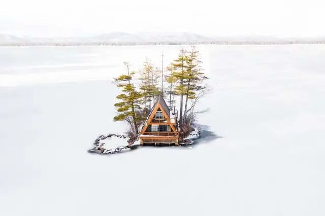 在美国最寒冷的冬天之一,一个小木屋在新罕布什尔州结冰的湖中央幸存下来。它与大自然的宁静环境完全隔离。