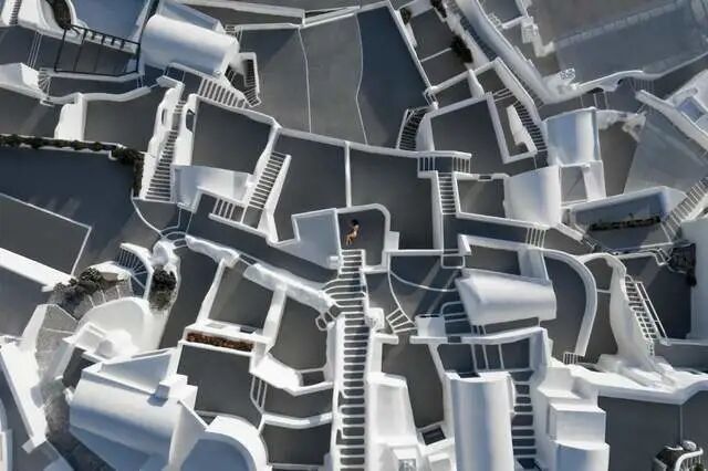 12 月中旬,在圣托里尼的一家关闭的酒店上空拍摄的抽象照片。在隔离期间,摄影师有时间享受这个小火山岛并捕捉它的精髓。