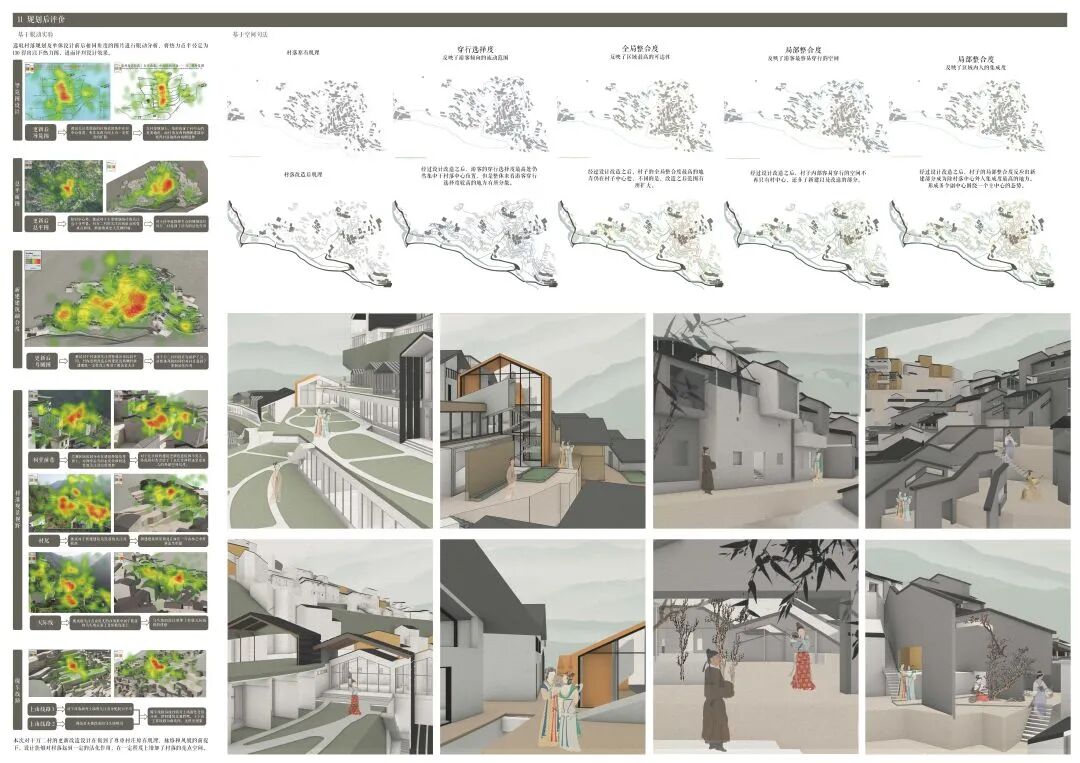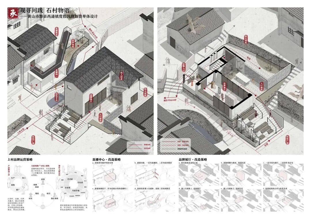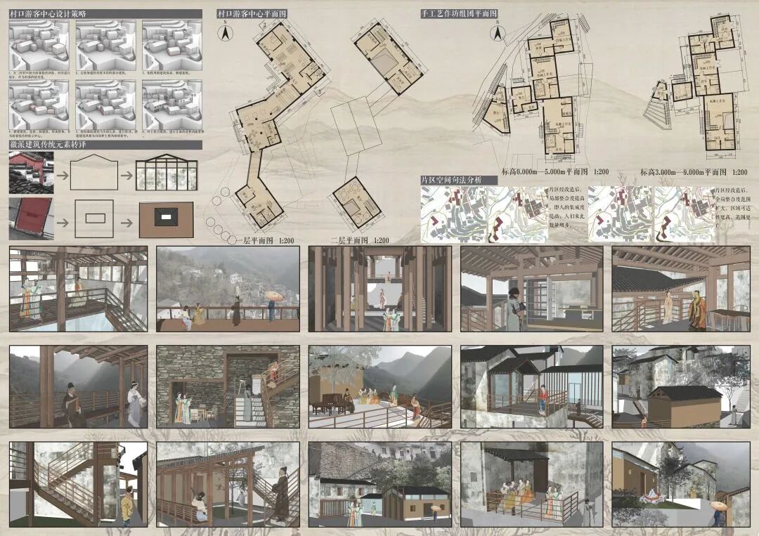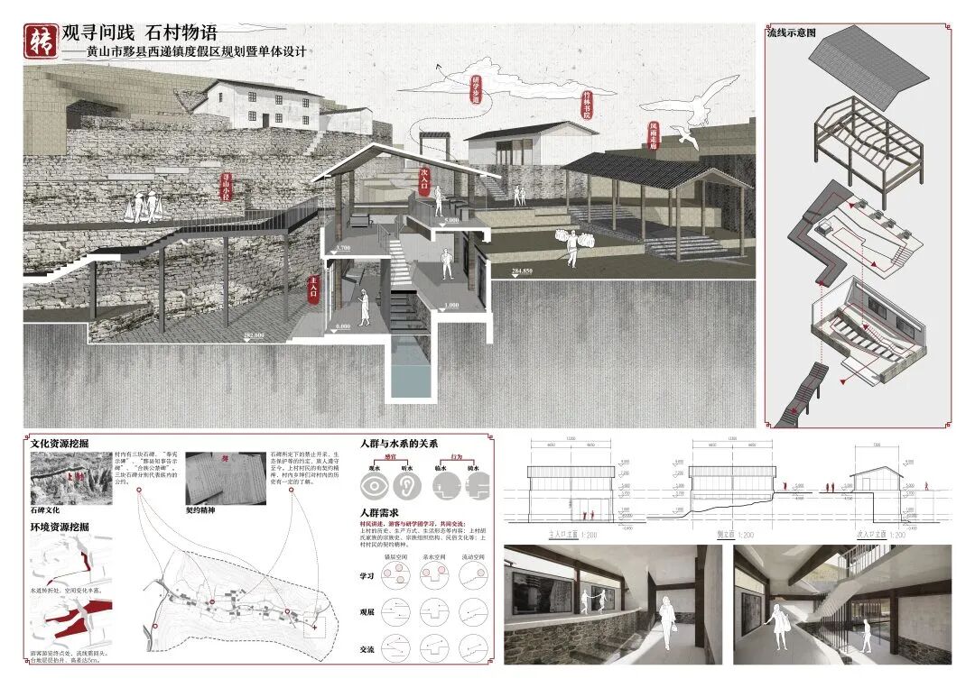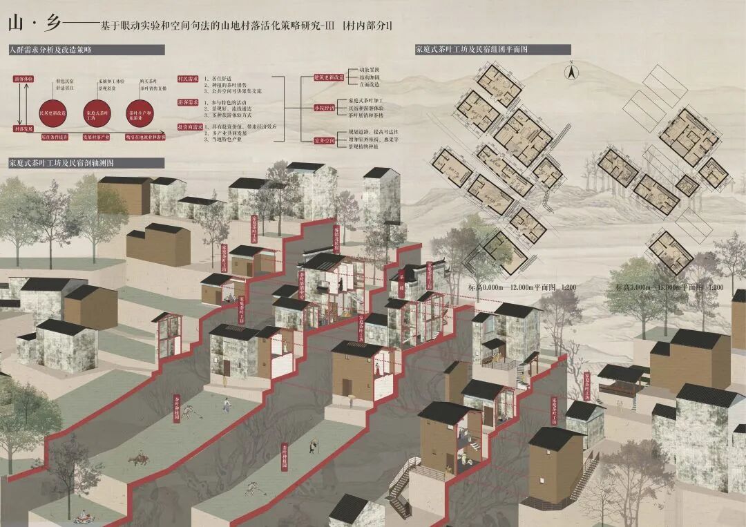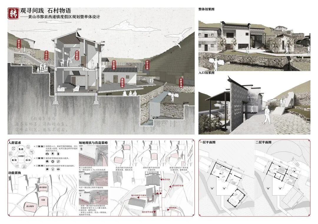 万二村位于黄山市歙县昌溪乡境内的山坡之上,村内建筑延山势跌落延展,青石板路蜿蜒辗转,石砌地基古朴坚实,现存大量的文化历史,被誉为“徽州布达拉宫”。但村中缺乏产业经济,人口流失严重,村落记忆难以传承,现存状况不容乐观。为活化传承古徽州地区的传统村落,再度盘活其得天独厚的历史、文化、生态资源,本设计对万二村重新规划设计。设计中利用眼动追踪和空间句法的方法对村落现状进行分析指导规划设计,同时进行设计后评估,以求较为客观地切实解决村落现存问题。在建筑设计方面,于村内采用建筑针灸的策略,以点带面盘活整个村落;于村外加建摄影写生基地和茶工坊,以求为村民打造更为系统的自有产业。