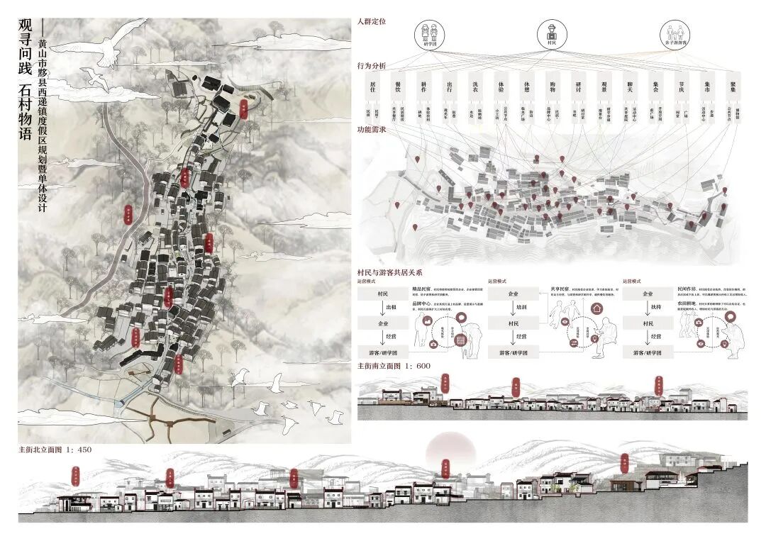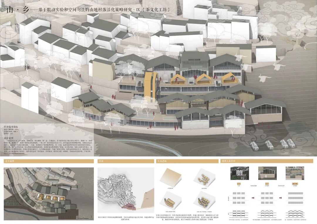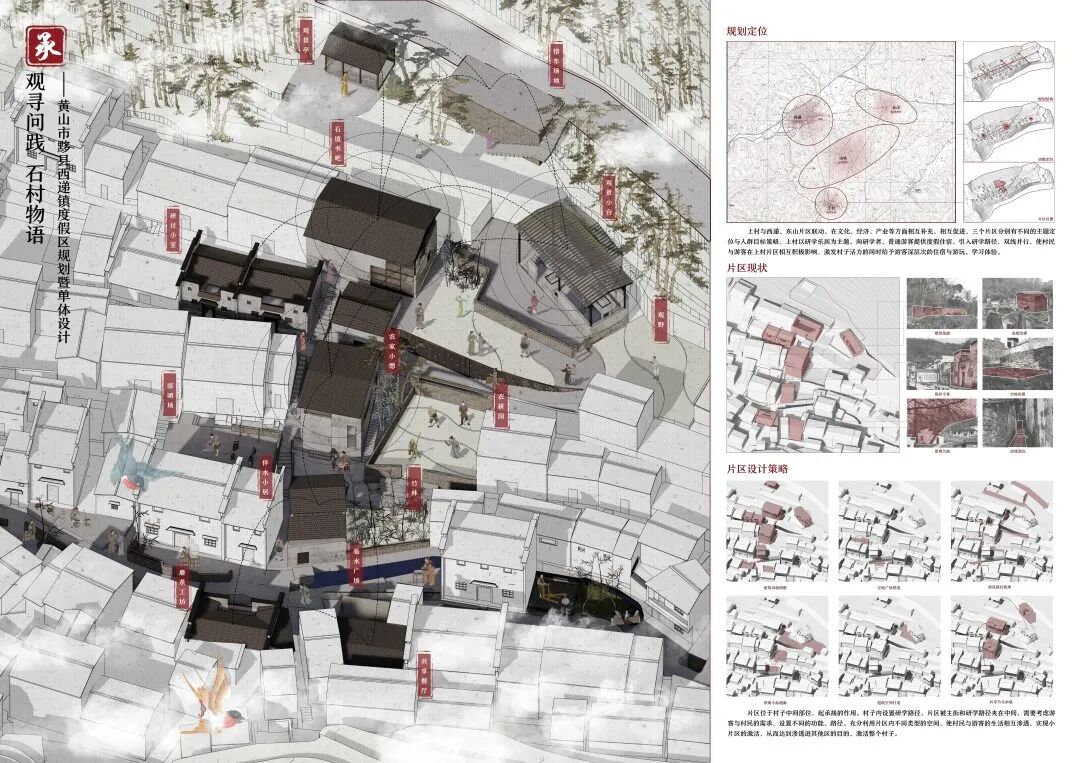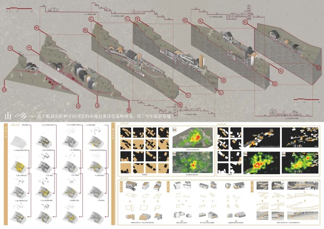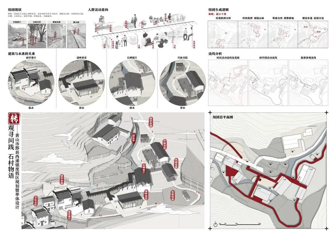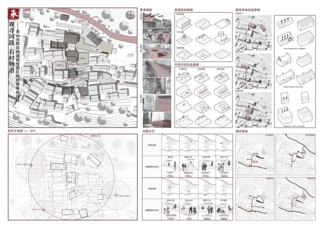 万二村位于黄山市歙县昌溪乡境内的山坡之上,村内建筑延山势跌落延展,青石板路蜿蜒辗转,石砌地基古朴坚实,现存大量的文化历史,被誉为“徽州布达拉宫”。但村中缺乏产业经济,人口流失严重,村落记忆难以传承,现存状况不容乐观。为活化传承古徽州地区的传统村落,再度盘活其得天独厚的历史、文化、生态资源,本设计对万二村重新规划设计。设计中利用眼动追踪和空间句法的方法对村落现状进行分析指导规划设计,同时进行设计后评估,以求较为客观地切实解决村落现存问题。在建筑设计方面,于村内采用建筑针灸的策略,以点带面盘活整个村落;于村外加建摄影写生基地和茶工坊,以求为村民打造更为系统的自有产业。