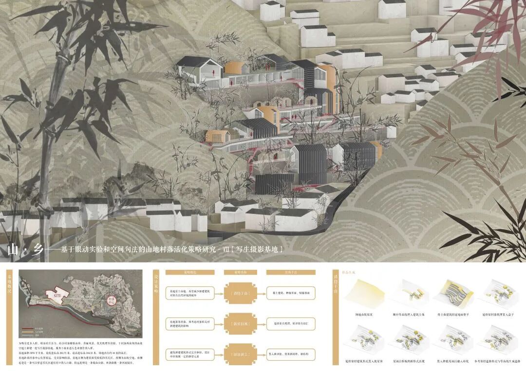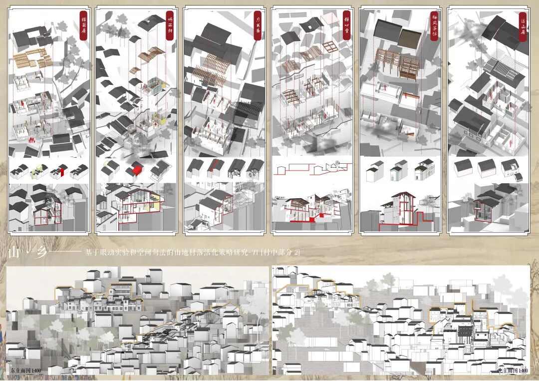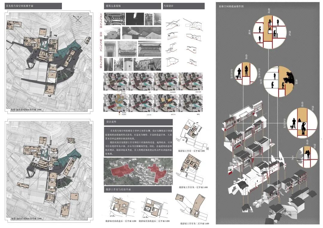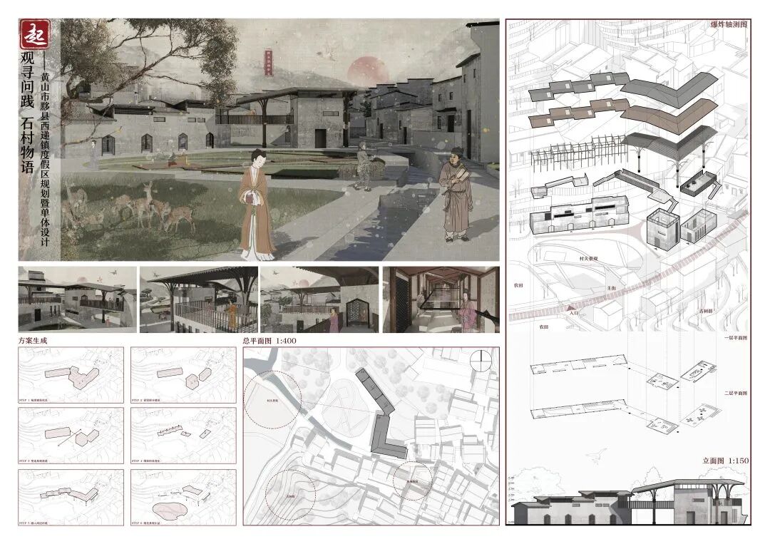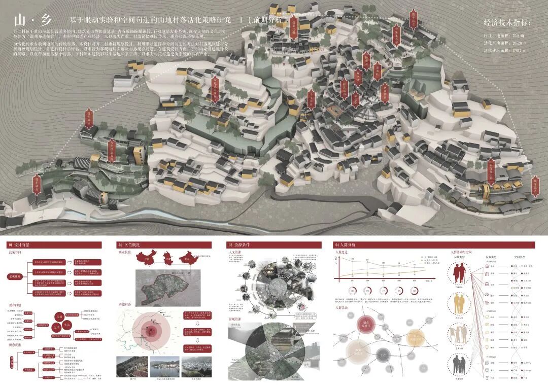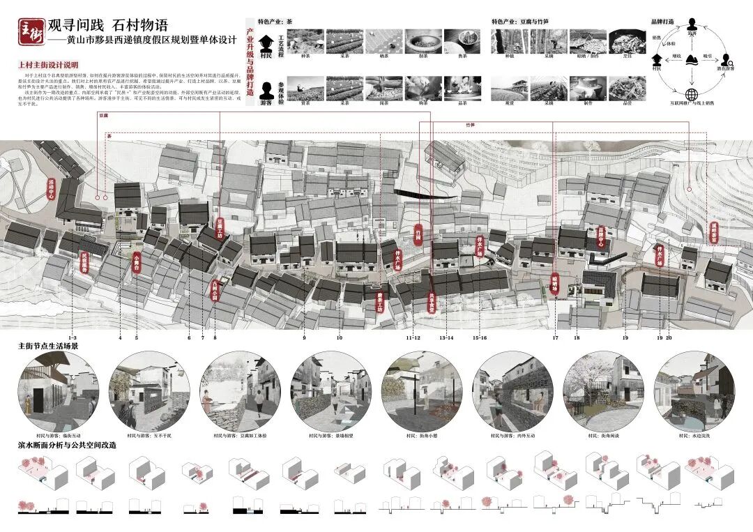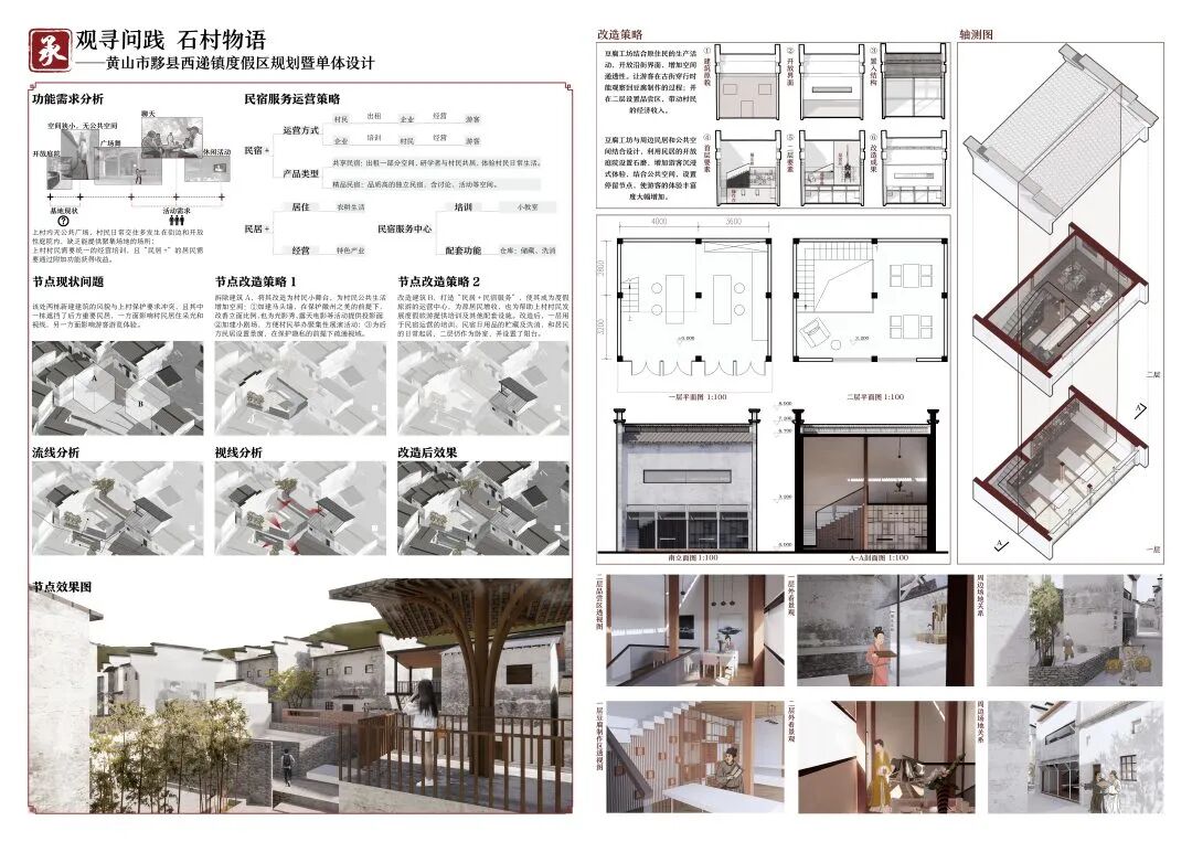 万二村位于黄山市歙县昌溪乡境内的山坡之上,村内建筑延山势跌落延展,青石板路蜿蜒辗转,石砌地基古朴坚实,现存大量的文化历史,被誉为“徽州布达拉宫”。但村中缺乏产业经济,人口流失严重,村落记忆难以传承,现存状况不容乐观。为活化传承古徽州地区的传统村落,再度盘活其得天独厚的历史、文化、生态资源,本设计对万二村重新规划设计。设计中利用眼动追踪和空间句法的方法对村落现状进行分析指导规划设计,同时进行设计后评估,以求较为客观地切实解决村落现存问题。在建筑设计方面,于村内采用建筑针灸的策略,以点带面盘活整个村落;于村外加建摄影写生基地和茶工坊,以求为村民打造更为系统的自有产业。