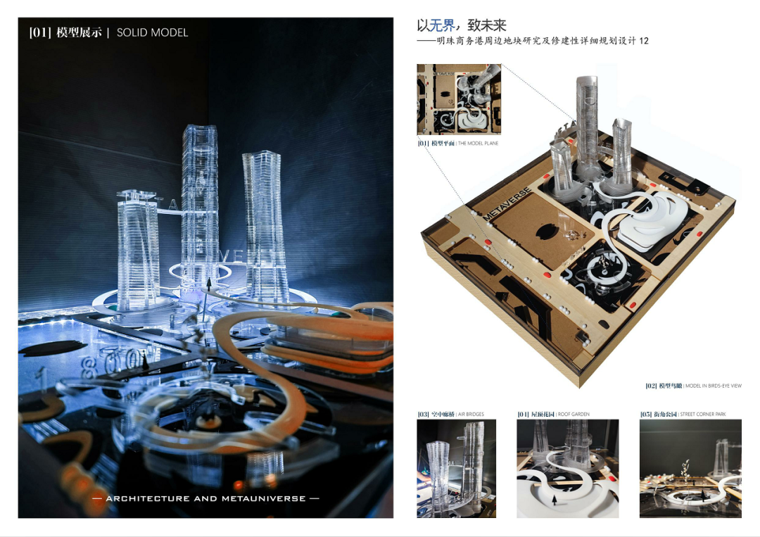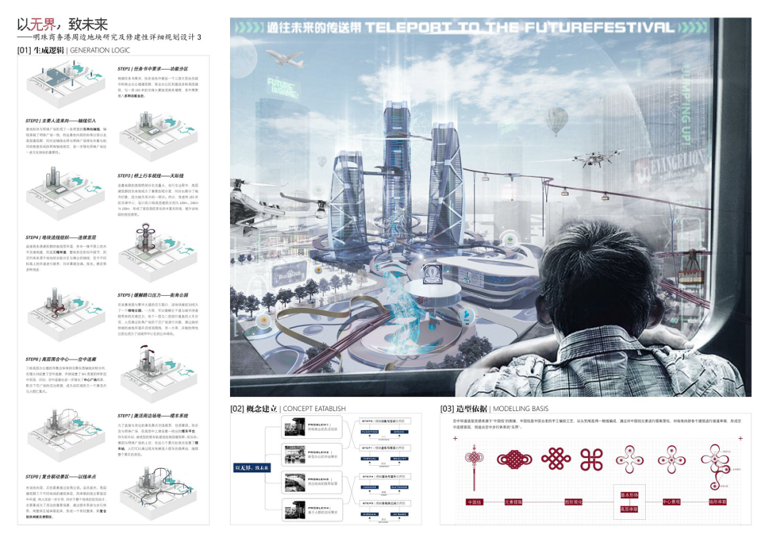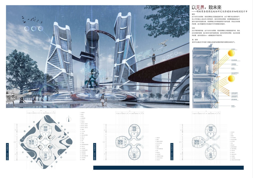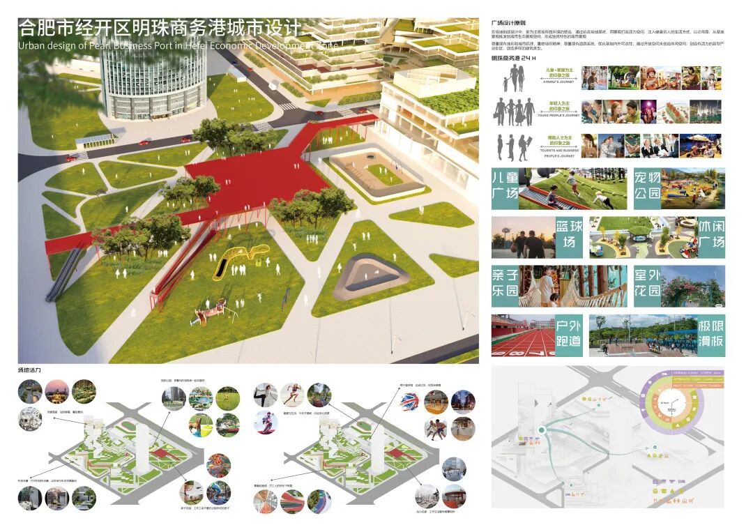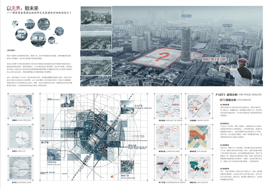明珠广场曾作为合肥著名的地标,繁盛一时。近些年伴随政务区的崛起,明珠商圈逐渐没落,地块之中的徽园、欢乐谷也面临着日益萧条的窘境。本设计主要基于对周边地块的研究,探讨如何对基地内部及基地周边进行修建性详细规划设计,既能够反映场地特征,解答场地疑问,又可以满足使用人群的需求,贴合时代背景。在调研过程中发现,从场地出发,场地及周边各景观要素的联系薄弱,区域整合度不高,步行体系不够连贯,而从人群与业态出发,传统的商售模式又很难持续吸引年轻群体,由此,该项目提出了“以无界,致未来”的设计理念,希望通过模糊包括虚拟与现实、功能与空间、室内与室外以及各地块之间的界限,以之为初步策略,结合相关规范要求,用技术为场景赋能,场景的串联又为区域带来持久的活力。最终,该设计能够在面向未来、拥抱新技术的同时具备落地的可能性,为该类型的商务港设计提供一种新的思路。