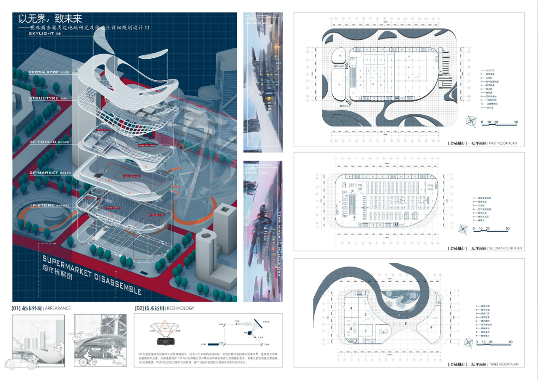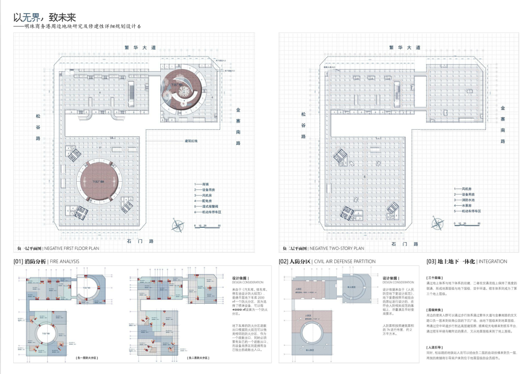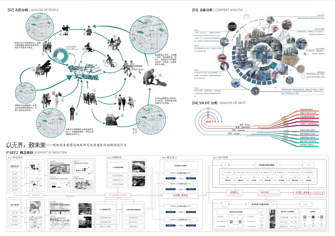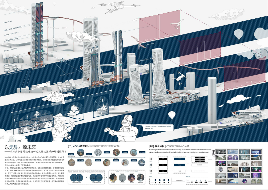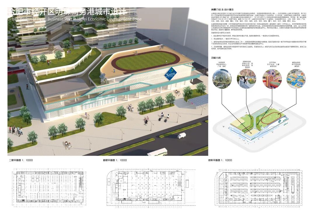 明珠广场曾作为合肥著名的地标,繁盛一时。近些年伴随政务区的崛起,明珠商圈逐渐没落,地块之中的徽园、欢乐谷也面临着日益萧条的窘境。本设计主要基于对周边地块的研究,探讨如何对基地内部及基地周边进行修建性详细规划设计,既能够反映场地特征,解答场地疑问,又可以满足使用人群的需求,贴合时代背景。在调研过程中发现,从场地出发,场地及周边各景观要素的联系薄弱,区域整合度不高,步行体系不够连贯,而从人群与业态出发,传统的商售模式又很难持续吸引年轻群体,由此,该项目提出了“以无界,致未来”的设计理念,希望通过模糊包括虚拟与现实、功能与空间、室内与室外以及各地块之间的界限,以之为初步策略,结合相关规范要求,用技术为场景赋能,场景的串联又为区域带来持久的活力。最终,该设计能够在面向未来、拥抱新技术的同时具备落地的可能性,为该类型的商务港设计提供一种新的思路。