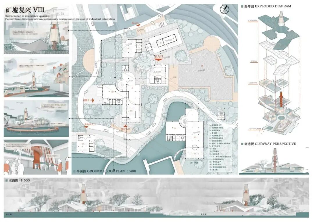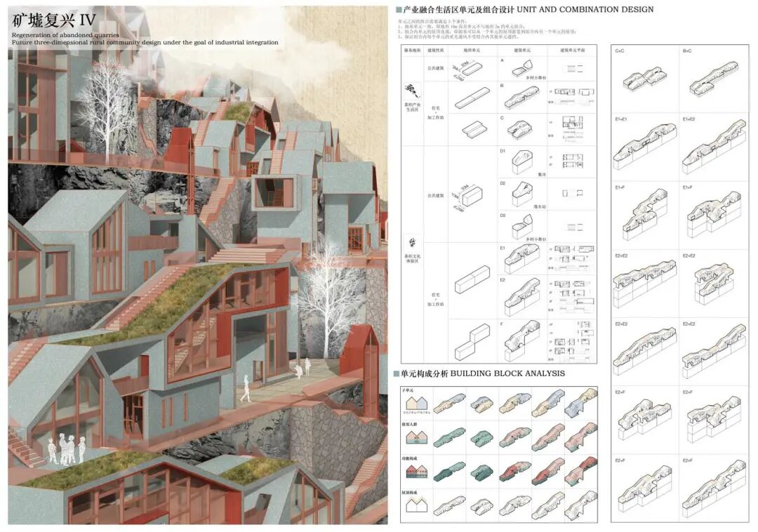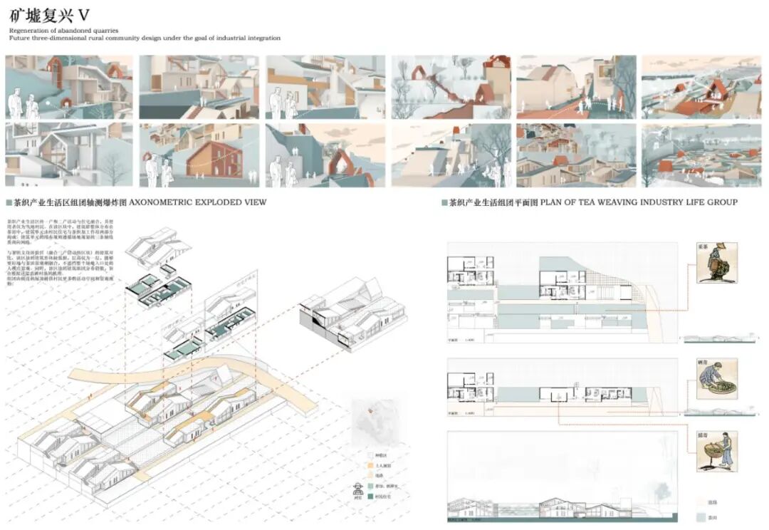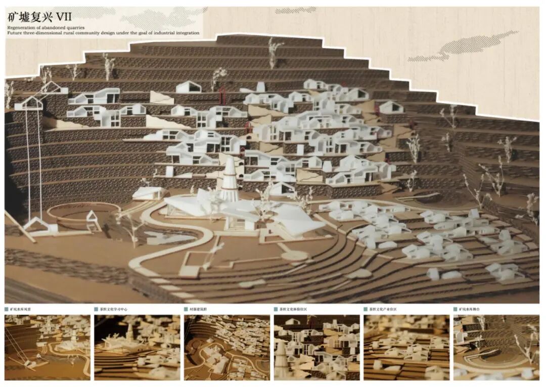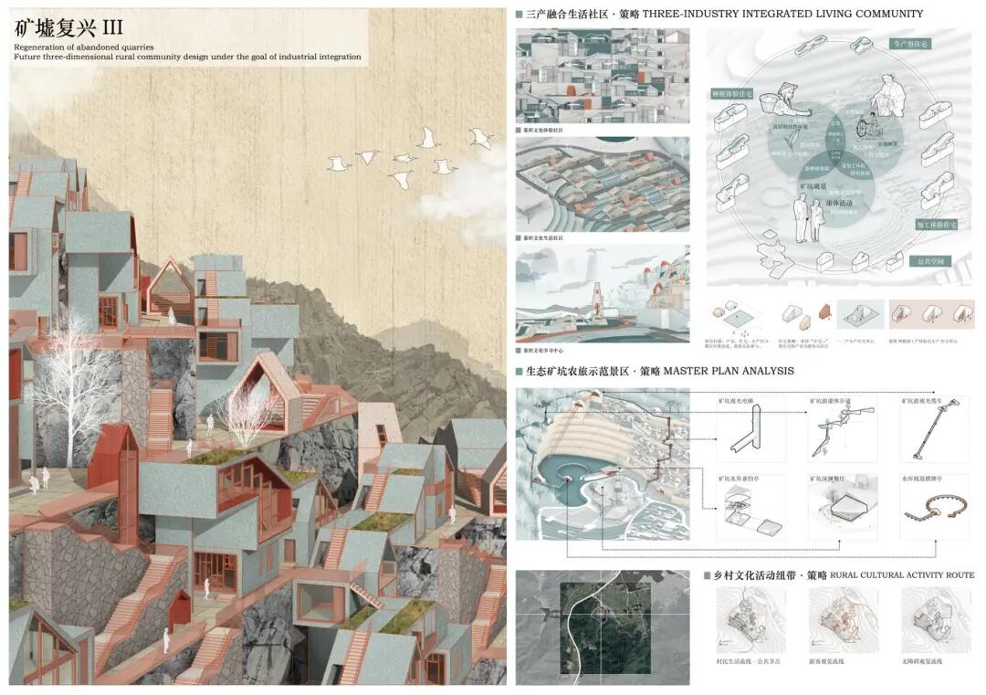 浙江省绍兴市诸暨市应店街镇十二都村曾经以采矿业作为第一产业,随之后来国内市场形势的变化,村内矿场相继关闭后,留下一众大小不一废弃矿坑,十二都村也走向衰落。设计对场地现状进行分析总结场地面临的核心问题:乡村困境、矿坑修复、公共空间匮乏,并核心目标及核心解决策略:以打造三产融合生活社区来改善乡村困境问;将利用现有矿坑景观作为旅游示范景区对废弃矿坑进行再利用;将村落内的公共空间进行整合,服务自身居民的同时也服务于周边村落居民。十二都村孟家湾废弃矿山空间进行改造,希望能够作为未来立体乡村社区的示范点,通过“产业单元”+“住宅单元”的建筑形式将自身产业相融合,帮助该地区矿山修复改造,同时促进三产的融合发展旅游业和自身产业。