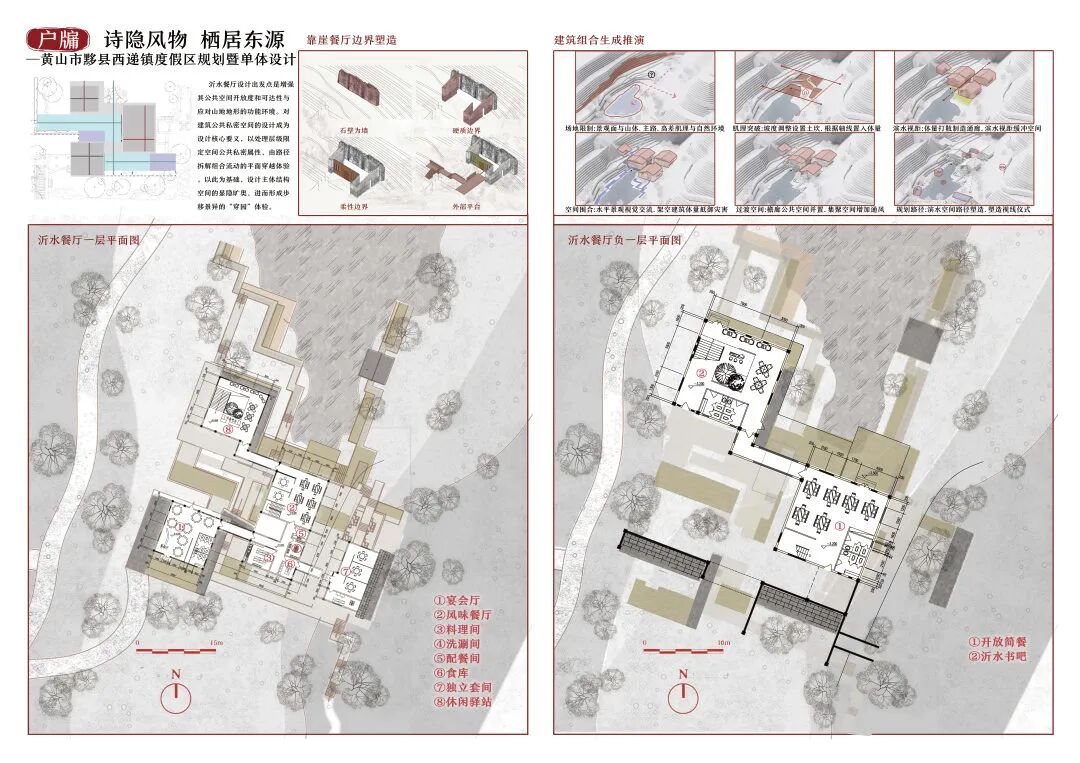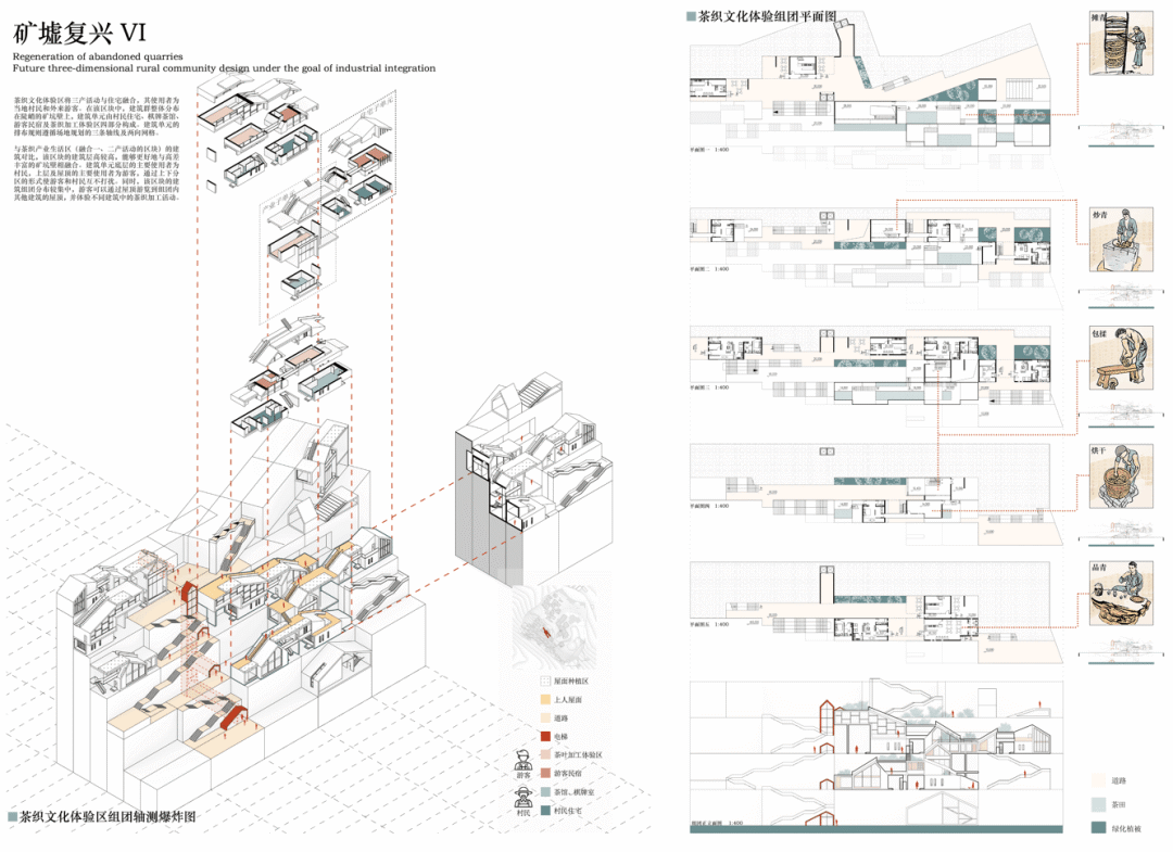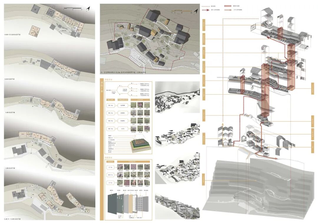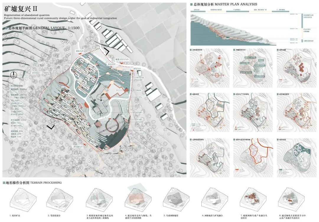 浙江省绍兴市诸暨市应店街镇十二都村曾经以采矿业作为第一产业,随之后来国内市场形势的变化,村内矿场相继关闭后,留下一众大小不一废弃矿坑,十二都村也走向衰落。设计对场地现状进行分析总结场地面临的核心问题:乡村困境、矿坑修复、公共空间匮乏,并核心目标及核心解决策略:以打造三产融合生活社区来改善乡村困境问;将利用现有矿坑景观作为旅游示范景区对废弃矿坑进行再利用;将村落内的公共空间进行整合,服务自身居民的同时也服务于周边村落居民。十二都村孟家湾废弃矿山空间进行改造,希望能够作为未来立体乡村社区的示范点,通过“产业单元”+“住宅单元”的建筑形式将自身产业相融合,帮助该地区矿山修复改造,同时促进三产的融合发展旅游业和自身产业。