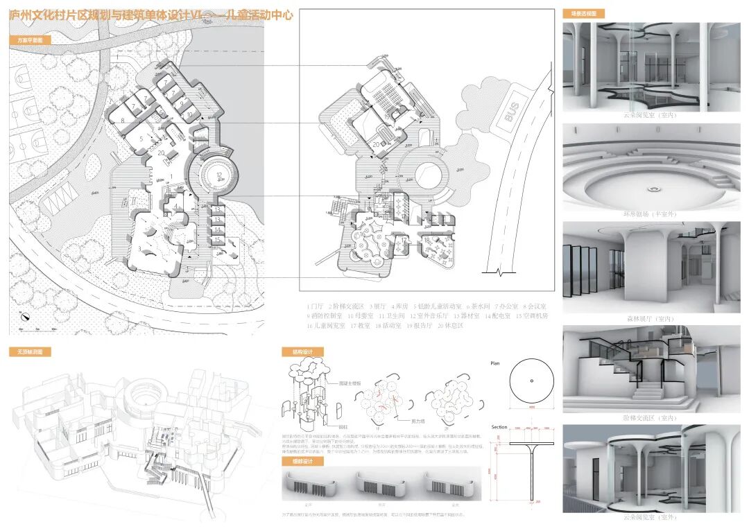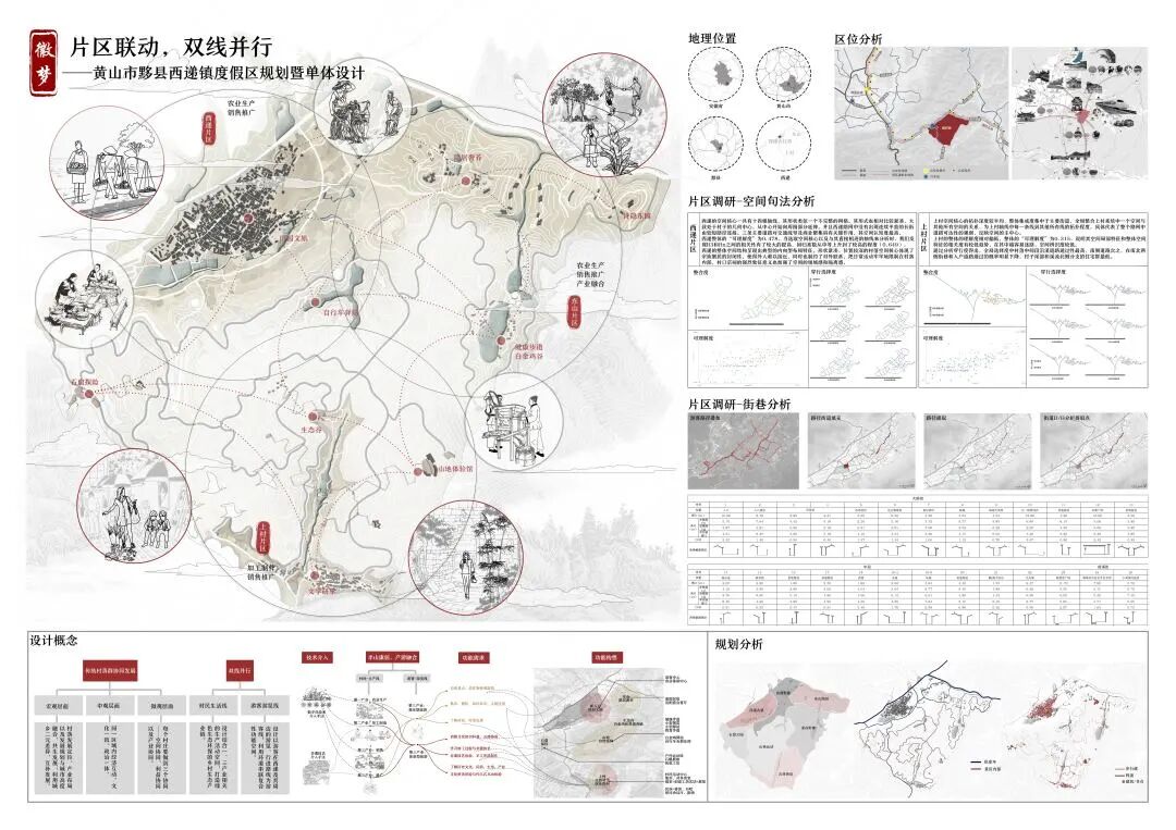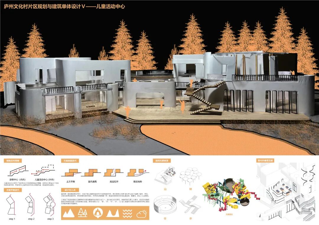故本次设计以此出发点,基于城乡结合带的地缘优势探索当下超大城市周边乡村振兴发展的新趋势,以第一产业为基础、第三产业为创新发展的模式将城市周边自然与农业的周末家庭游、周末亲子游带动起来,并且通过设计为产业赋能,促进高质量发展。同时应对亲子家庭出行这一群体的出游需求,在规划的中加入了有助于儿童成长认知的体验区,寓教于乐,在游玩过程中学习成长。将儿童作为主要使用者去探索空间设计,塑造丰富的建筑空间形式。