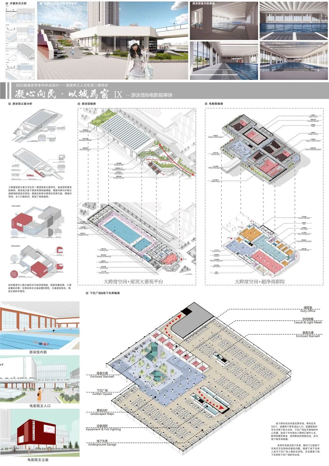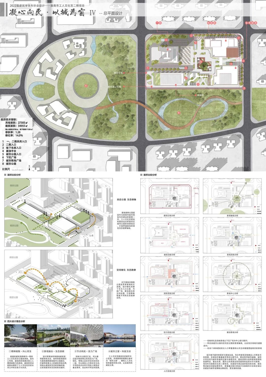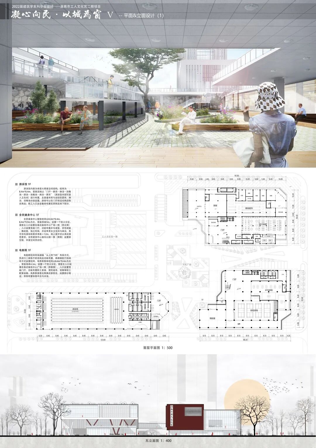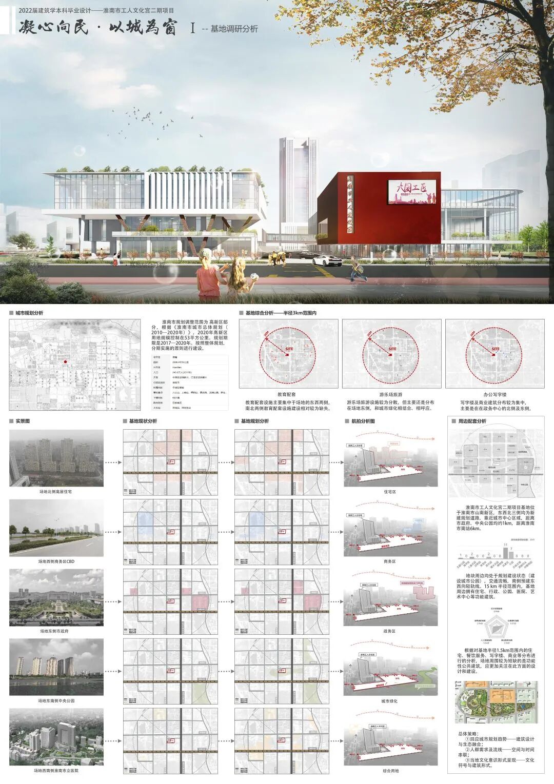 文化宫二期项目的设计,是充分基于淮南市城市的整体详细布局规划及形势。本次设计将从对职工生活的需求、文化创新的需求、城市化转型的需求等多角度多元化的需求进行研究,努力打造淮南市工人文化宫这一座新的城市的地理名片,展现这座城市从历史到未来的演变与规划。